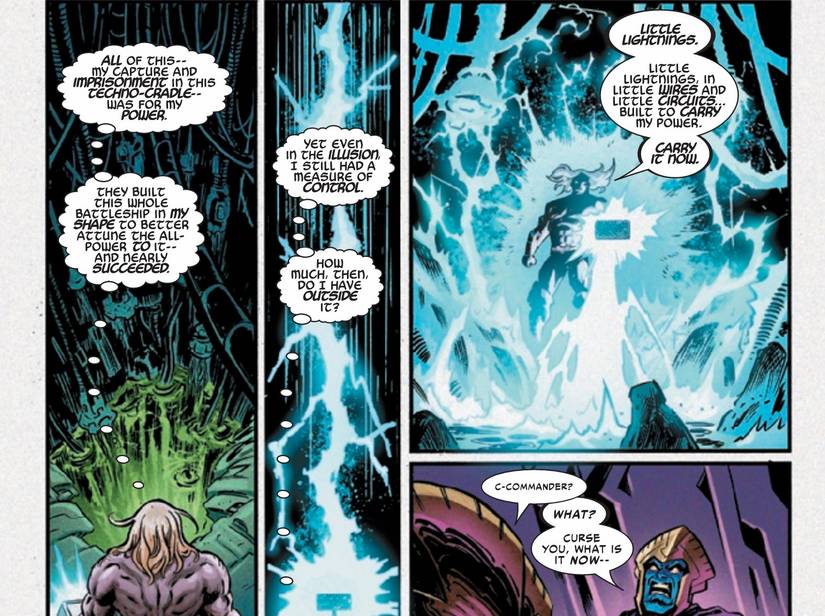Giant-Size Thor #1 surge de la serie simultánea Thor inmortal Serie en curso, en la que Thor ha expandido su control sobre los rayos como nunca antes. No solo puede darles forma, sino que Thor puede hablar con los rayos y desviar ataques con solo pedirles que se muevan. Esto es exactamente lo que hace Thor en Tamaño gigante n.° 1; le ordena a la electricidad almacenada dentro de un robot gigante que lo obedezca y transmita su mensaje. No es él quien invoca un rayo a través de Mjölnir, es él quien dando forma a un rayo existente, demostrando maestría en sus poderes.