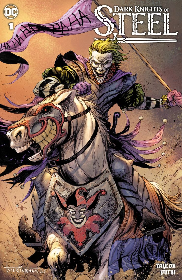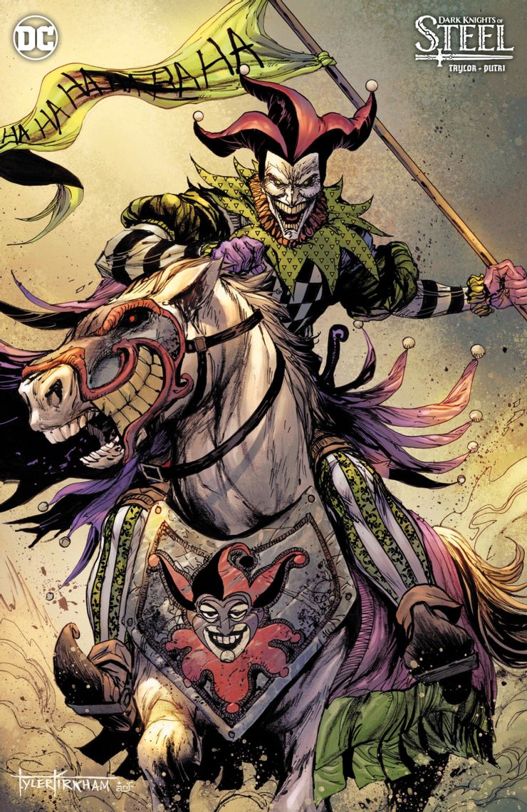 Si bien es probable que pocos fanáticos esperaran que Green Man fuera Luthor, muchos menos habían predicho que también sería Joker. De hecho, parecía que los fans ya habían estado expuestos a la Caballeros oscuros de acero Joker en algunas portadas variantes para el primer número de la serie. Dibujadas por el artista Tyler Kirkham, dos variantes ligeramente diferentes muestran una versión medieval del payaso criminal. Al igual que Harley Quinn, quien es una heroica consejera en la historia hasta el momento, una portada muestra a Joker como un bufón oscuro, montando un caballo de guerra ataviado con su púrpura y verde. El otro se parece a un caballero, pero aún parece un Joker apto para el mundo de la espada y la hechicería de Caballeros oscuros de acero.