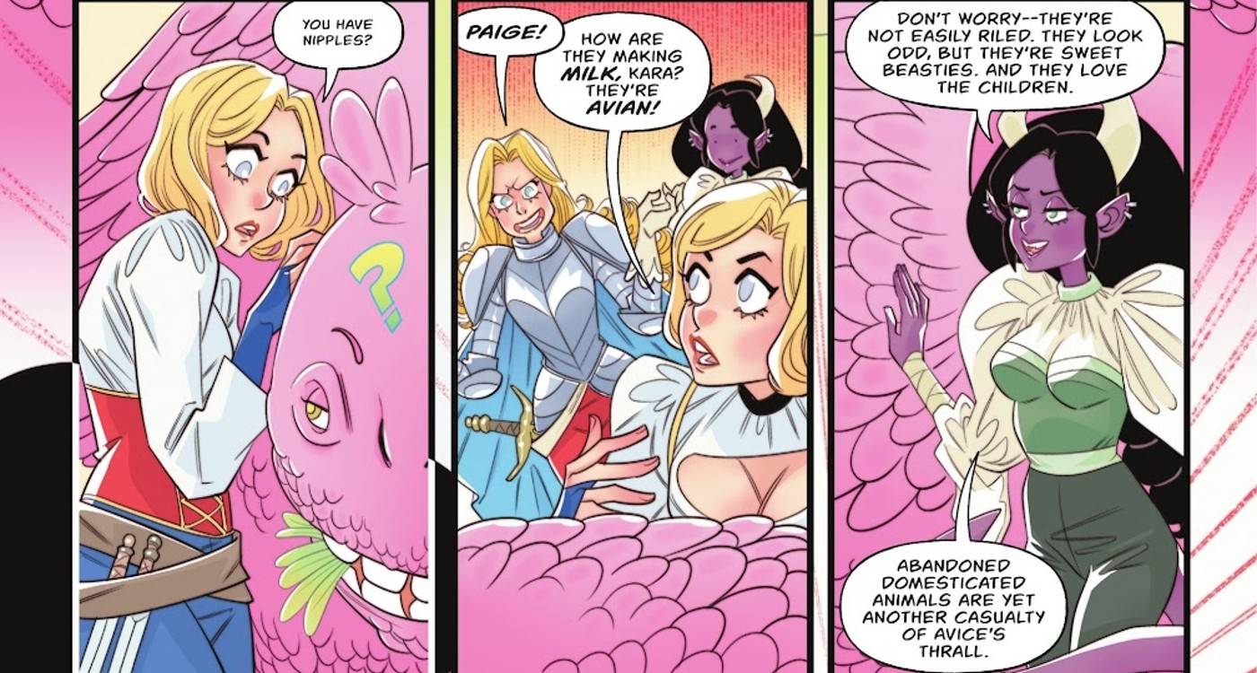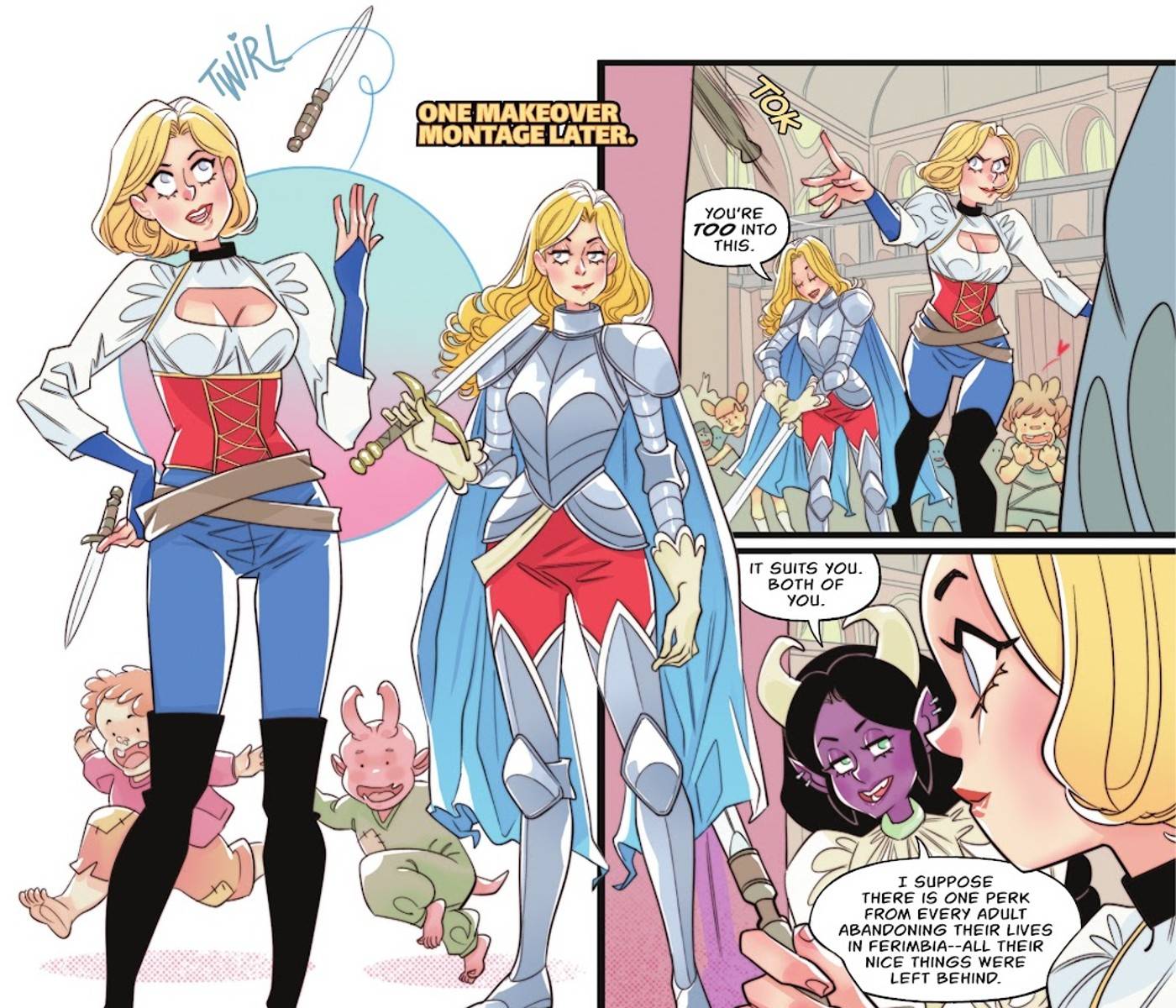 Sin embargo, chica poderosa El número 7 de Leah Williams, Marguerite Sauvage y Becca Carey ayuda a separar las dos entidades al mostrar cuán rebelde es realmente Power Girl. Al ser transportadas a un mundo de cuento de hadas, Power Girl y Supergirl deciden interpretar el papel cambiando sus trajes de superhéroe por disfraces que se ajusten a la época en la que se encuentran.