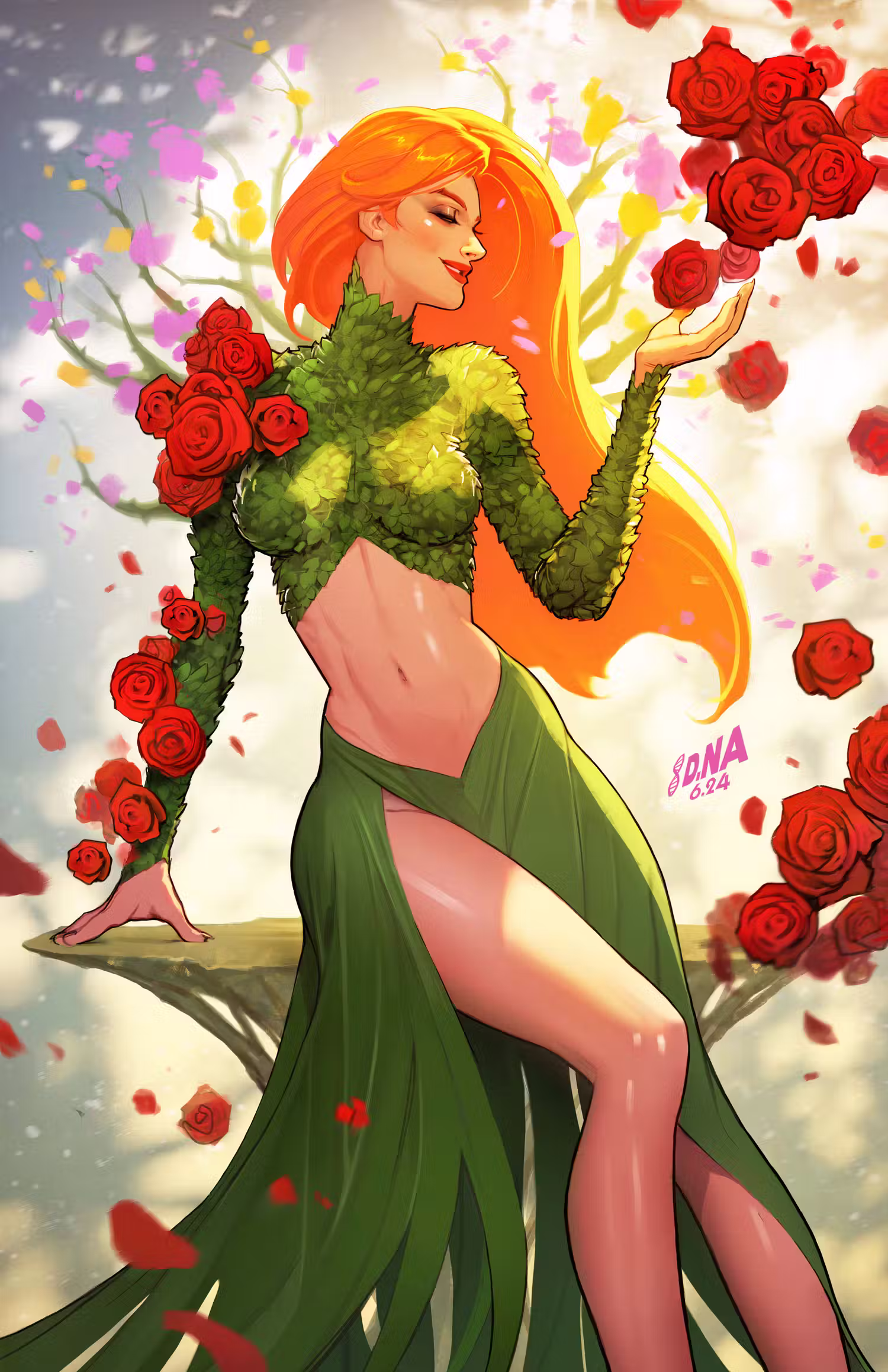 Poison Ivy luce un impresionante look de cuello alto y falda con abertura larga en el arte oficial de DC