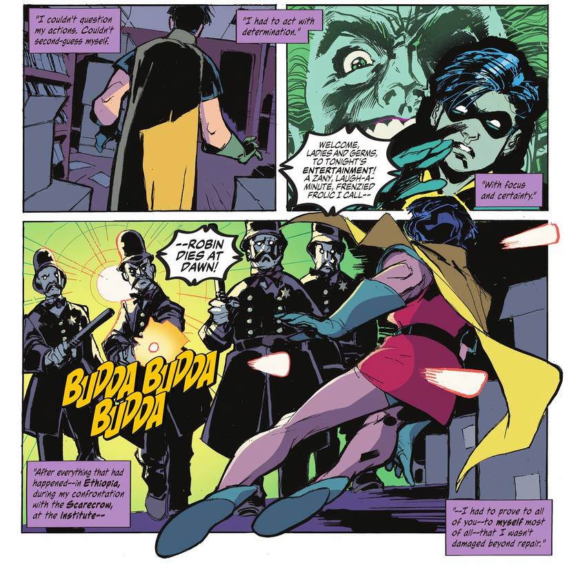 El enfrentamiento previsto entre Jason y Joker comienza bastante bien, con el joven justiciero eliminando a los guardias animatrónicos, pero en el instante en que alcanza a su verdadero objetivo queda paralizado por el miedo. Es la oportunidad perfecta para que Joker le quite definitivamente a Jason lo que intenta demostrar que se merece: su papel como Robin. Al adornarlo con un traje de payaso rojo, verde y amarillo y llamarlo Jokey el niño lacayo, Se burla del niño al que está aterrorizando. Jason ya estaba luchando por recuperar el control de sí mismo ante el trauma acumulado, y en cambio, el Joker ha tomado ese control por sí mismo.