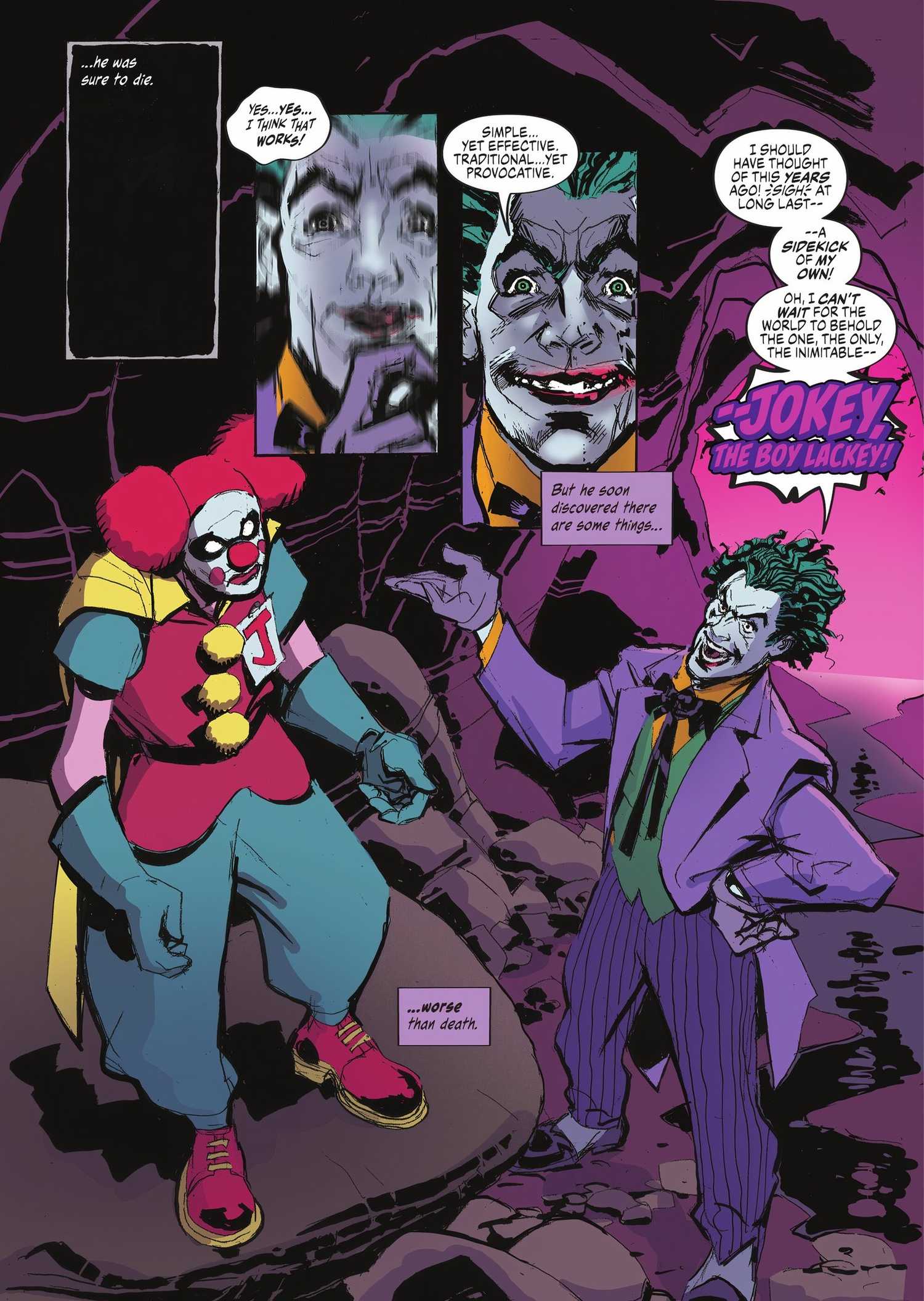 En su búsqueda por demostrar su valía, tanto a su mentor como a sí mismo, se dirige solo a enfrentarse al Joker, que está preparado para el encuentro. transforma a Jason de Robin en el payaso inspirado en “Jokey el niño lacayo.“
