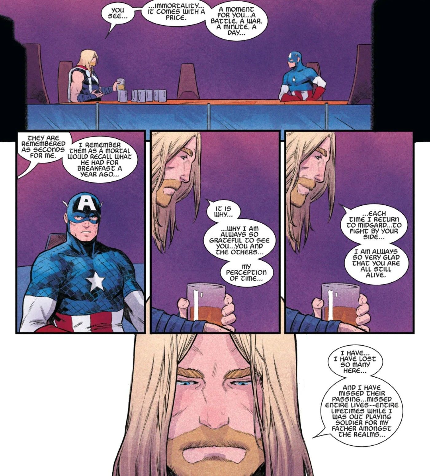 “/> Si bien Thor es conocido principalmente como un Vengador en la Tierra, el Dios nórdico del Trueno ha existido durante milenios y siempre supo que algún día sus aliados perecerán. En el arco de la ‘Dinastía Kang’ de Kurt Busiek y Manuel García Vengadores, Thor cae en una depresión por los amigos caídos, considerando dejar a los Vengadores y evitar la vida en la Tierra, ya que perder a sus asociados mortales duele casi demasiado como para soportarlo. También admitió (en Donny Cates, Michele Bandini y Alessandro Vitti) Thor #15) que debido a su naturaleza inmortal, experimenta el tiempo de manera diferente y ha abandonado la Tierra para misiones “cortas” en el pasado sólo para regresar y descubrir que personas importantes han fallecido, incluido al menos un interés amoroso. Estas experiencias tienden a llevar a Thor a un estado de abatimiento, que el arte de Acuña y Ross definitivamente evoca.