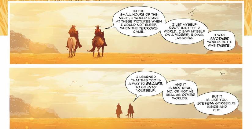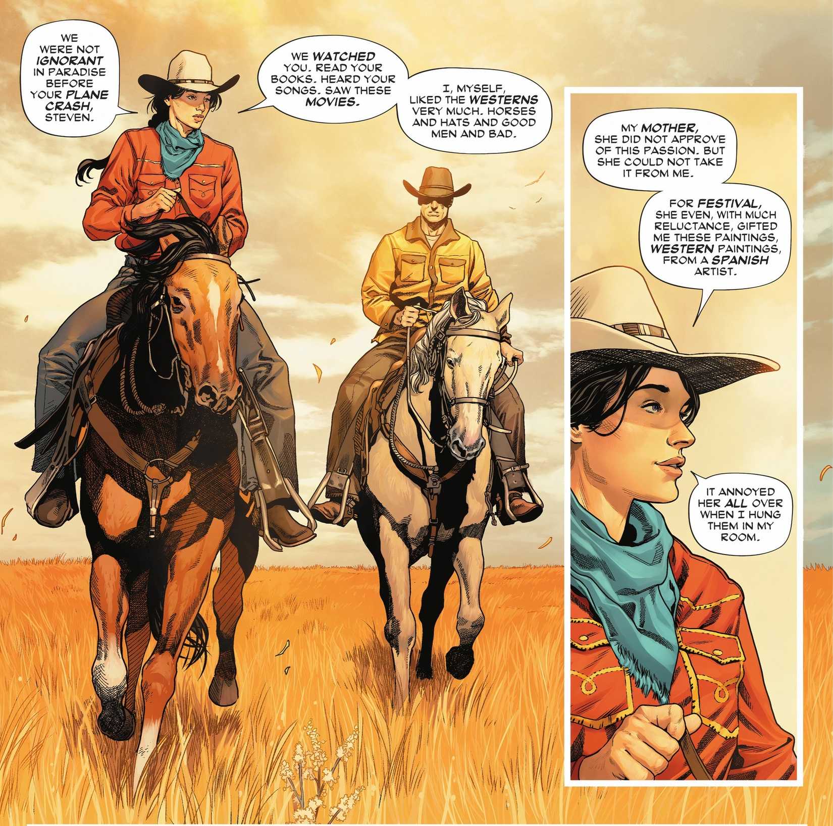 El número 8 se compone de varios paisajes oníricos a los que Wonder Woman escapa mentalmente mientras soporta la tortura del Soberano. Cada paisaje onírico presenta una ubicación diferente. Sin embargo, una constante une estos escapes: el coronel Steve Trevor, el principal y actual interés amoroso de Diana. Una de esas fantasías ve a Wonder Woman y Steve viviendo una escena sacada directamente de un viejo western., con ellos vestidos con el clásico traje de vaquero y montando a caballo a través de una vasta llanura de hierba dorada. El atuendo de Diana es particularmente notable, ya que podría traducirse fácilmente en un cosplay informal y genial.