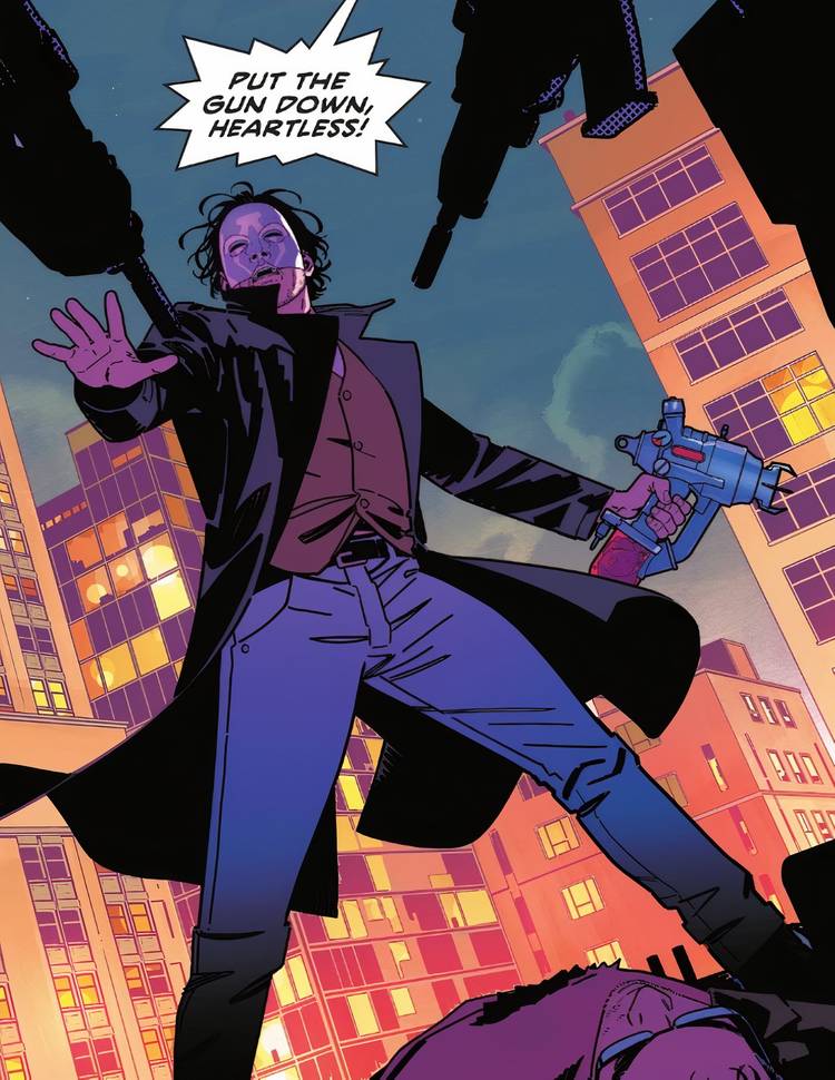 Luego le administran a Dick un sedante suave y lo secuestran como parte de su plan para incriminarlo como Sincorazón. Este plan implica que vistan al inconsciente Dick con el atuendo típico de Heartless, lo armen con la ‘pistola que extrae el corazón’ y lo dejen para que el Departamento de Policía de Bludhaven lo encuentre. después de una pista anónima, lo que esencialmente marcó el inicio de la era de villano de Dick.