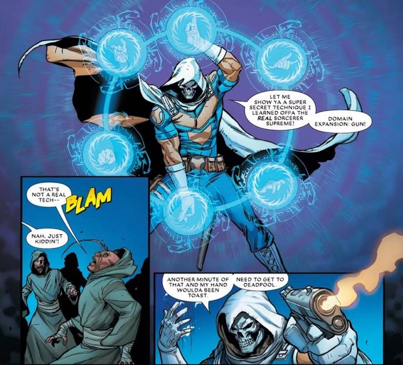 El chiste viene de nadie menos que Capatazya que hace referencia a las expansiones de dominio del popular anime/serie de Jujutsu Kaisen. Esto demuestra que Deadpool y cualquiera cercano a él en su última serie homónima se han convertido en los embajadores de Marvel del anime.