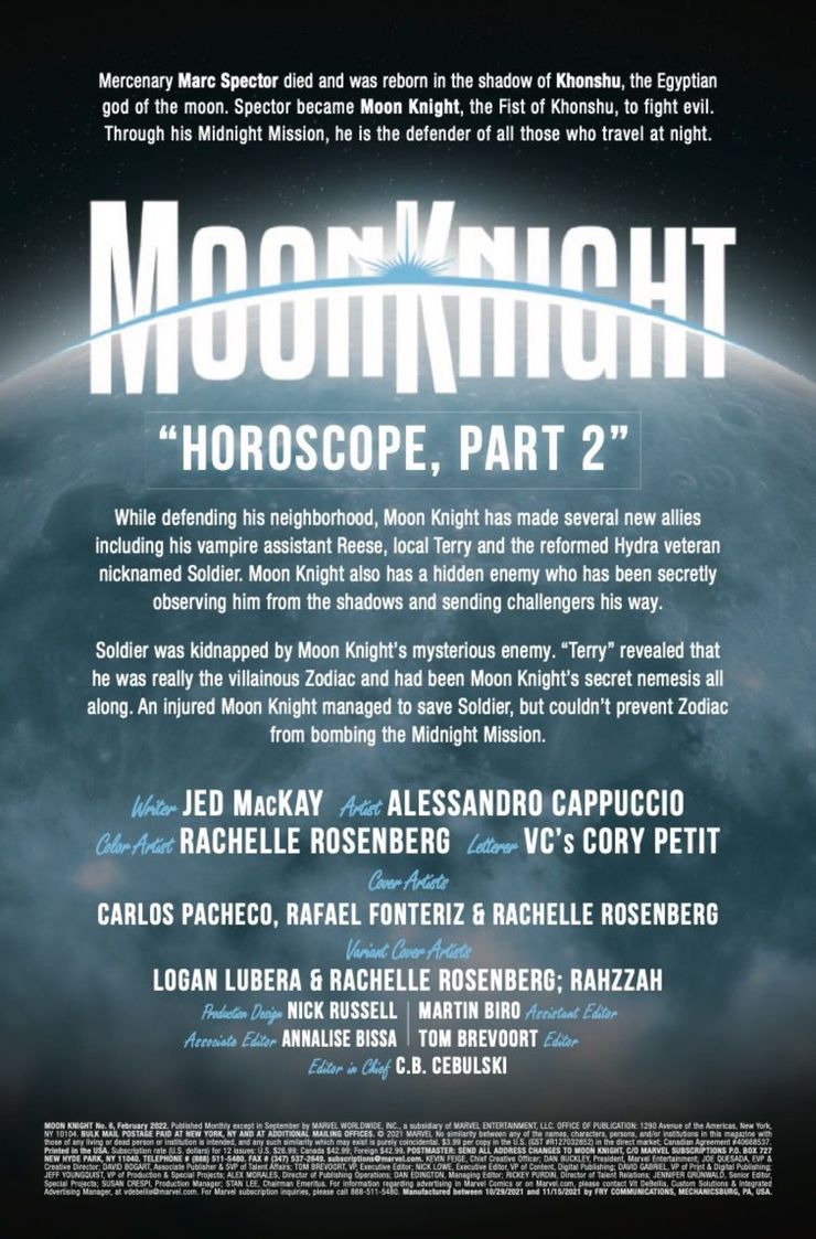 Moon Knight, bajo la dirección de su deidad patrona Khonshu, recientemente intentó robar los poderes de los Vengadores en un intento por derrotar a Mephisto. No tuvo éxito, y su fracaso lo llevó a reevaluar su relación con el dios de la luna. Luchando solo, Moon Knight regresa a la ciudad de Nueva York, abriendo la Misión de Medianoche para continuar su llamado de proteger a los viajeros por la noche, incluso si es sin el apoyo de Khonshu. Recientemente, un hombre misterioso llamado Zodiac ha estado jugando con Moon Knight e hizo su movimiento en el último número. Ahora, Moon Knight está a punto de aprender exactamente lo que Zodiac quiere con él. El número está escrito por Jed Mackay, con arte de Alessandro Cappucio, colores de Rachelle Rosenberg y letras de Cory Petit.