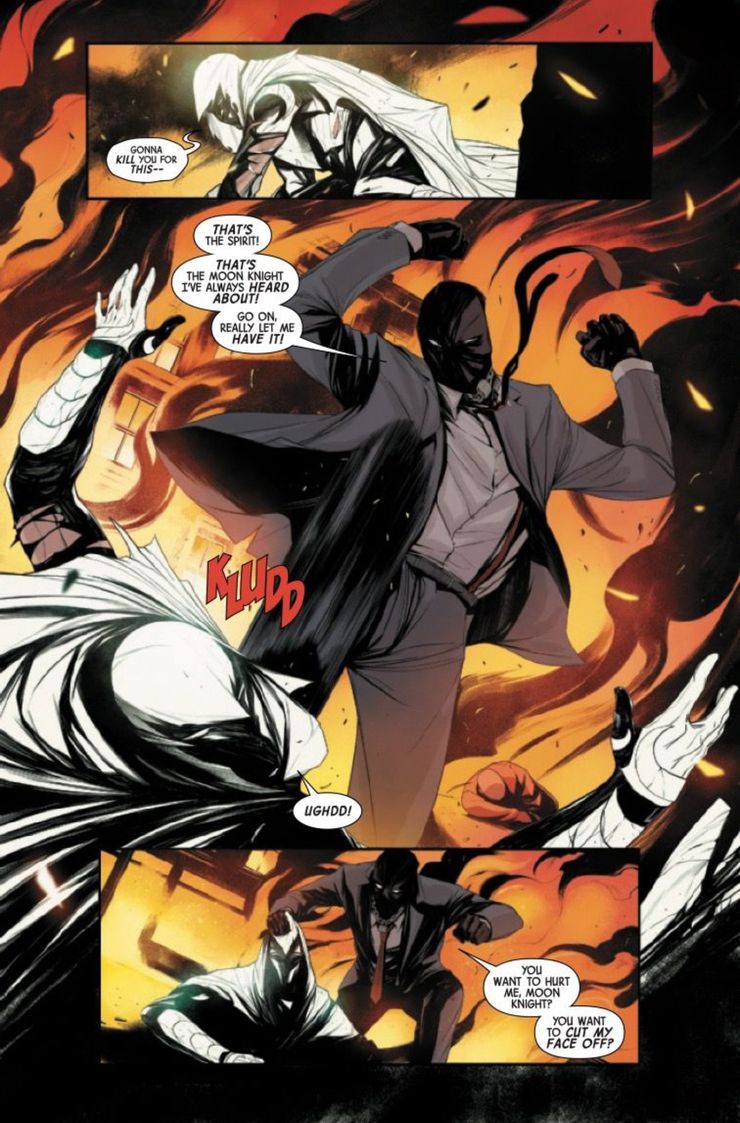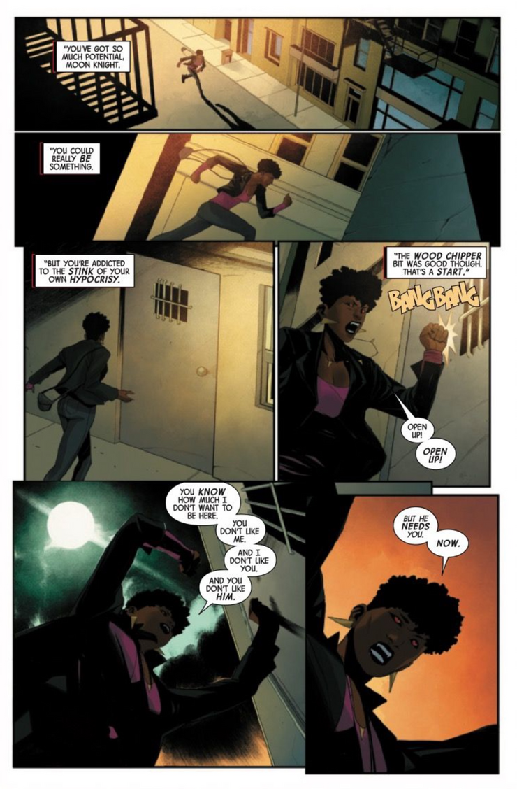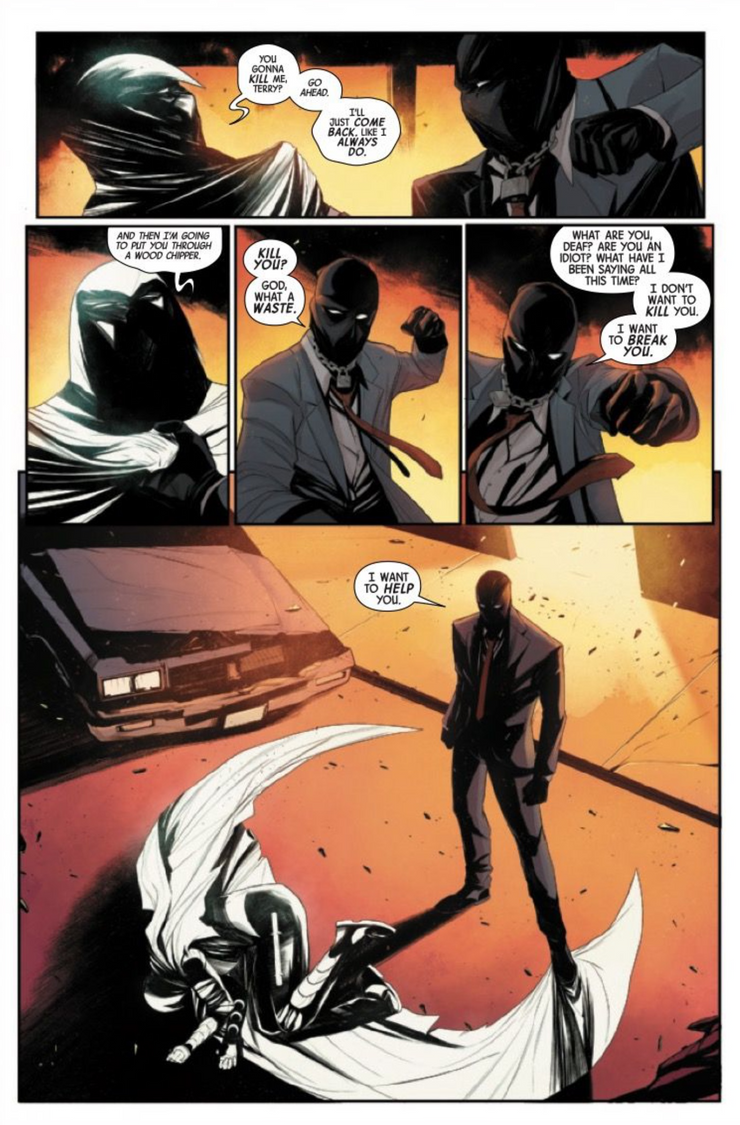 En una nueva vista previa compartida por AIPT, Moon Knight, golpeado y cepillado, amenaza con matar a Zodiac. Desafortunadamente, el villano desquiciado disfruta con esto y dice: “Ese es el Caballero de la Luna del que siempre he oído hablar”. Zodiac continúa incitando a Moon Knight, y Moon Knight le dice que si Zodiac lo mata, volverá y se vengará brutalmente. Zodiac, frustrado, le dice a Moon Knight que no está aquí para matarlo, sino para mejorarlo. La escena luego pasa a Reese, un aliado de Moon Knight y recientemente convertido en vampiro, tratando frenéticamente de encontrar ayuda. Zodiac le dice a Moon Knight que es adicto a su propia hipocresía, pero que tiene mucho potencial.