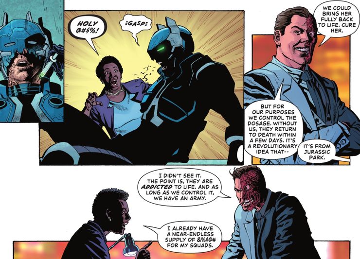 Task Force Z usa píldoras llenas de resina de los sobrenaturales Lazarus Pits para traer de vuelta a los muertos. Sin embargo, el programa puede controlar la dosis para que las resurrecciones sean solo parciales, convirtiendo así a los sujetos en zombis. Como tal, es una forma mucho más oscura y perturbadora de manipular a los supervillanos que simplemente incrustar bombas en el cuello de los enemigos vivos de DC. Amanda Waller está naturalmente intrigada, aunque responde que la idea no es tan revolucionaria como Two-Face lo presenta en este nuevo número.