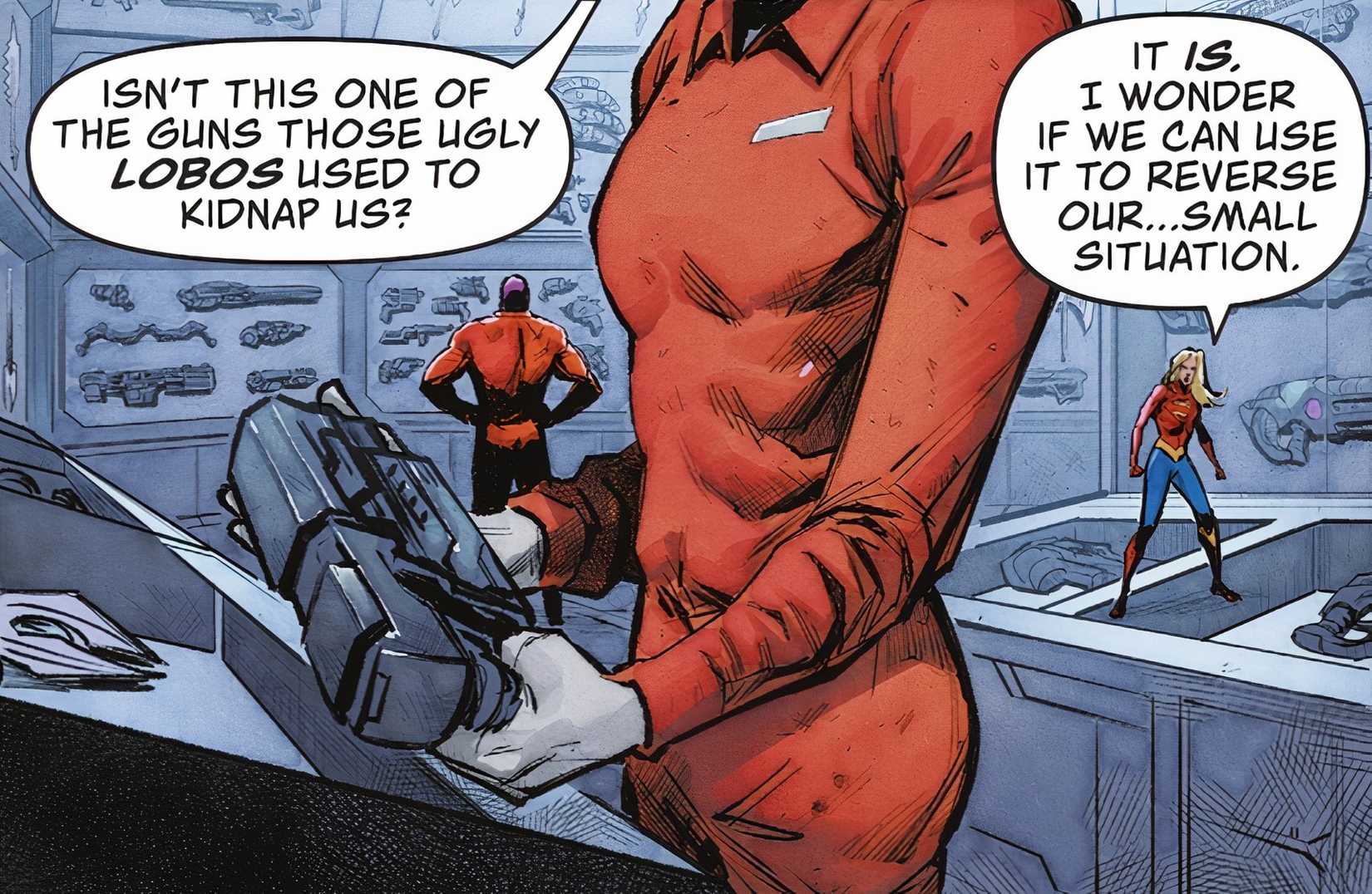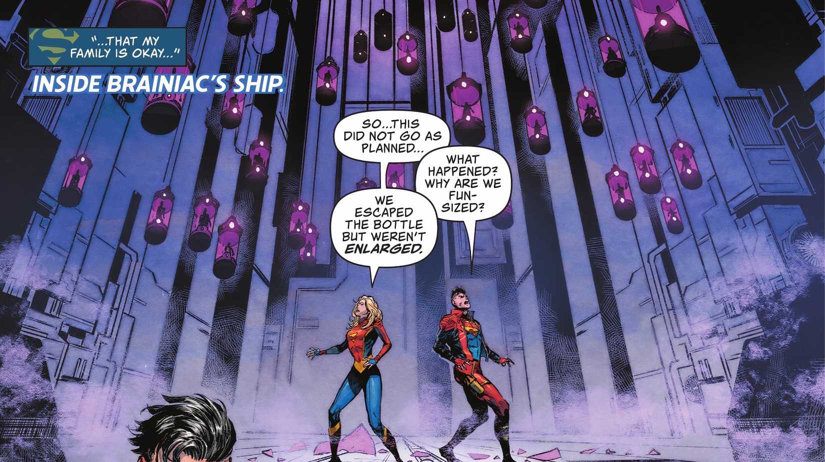 Casi desde que existe, Brainiac ha estado reduciendo las cosas. Si bien esto generalmente se interpreta como una amenaza seria y aterradora, la situación de Supergirl y Superboy se juega para reír y sorprendentemente funciona. Hay algo de tensión, claro, como cuando los dos tienen que evitar a los monstruos que Brainiac tiene vigilando su barco, pero en su mayor parte, Kara y Conner hacen reír mucho al lector con su situación. Honestamente, es difícil no reírse de Ver a Supergirl y Superboy, generalmente engreídos, verse obligados a montar sobre los hombros de Parasite y Livewire..