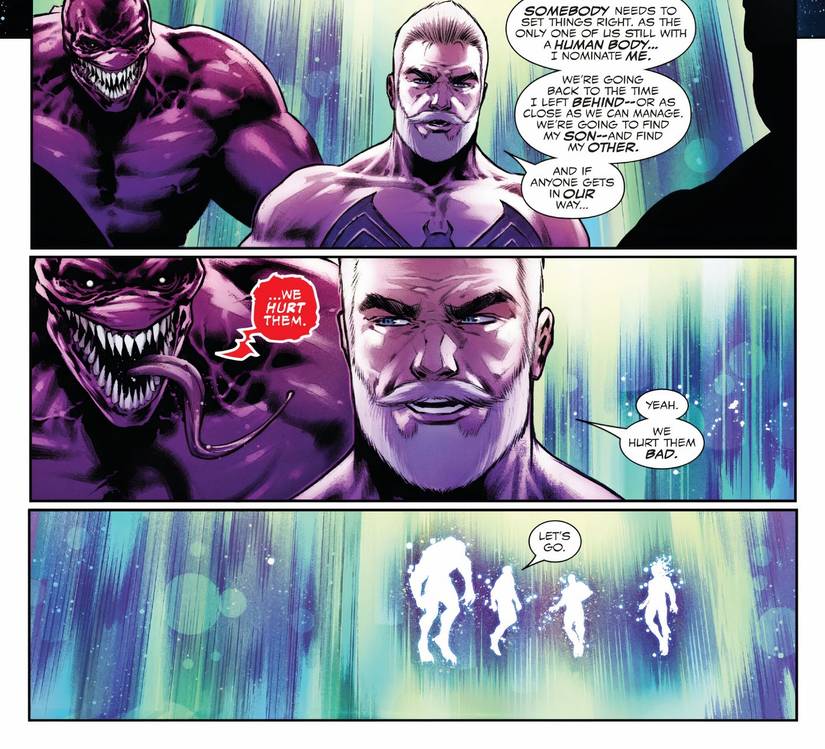 - Con cuatro Eddie Brocks, cada uno inmortal y que controla el tiempo, el espacio y la materia, los demás héroes de la Tierra se enfrentan a una formidable competencia.