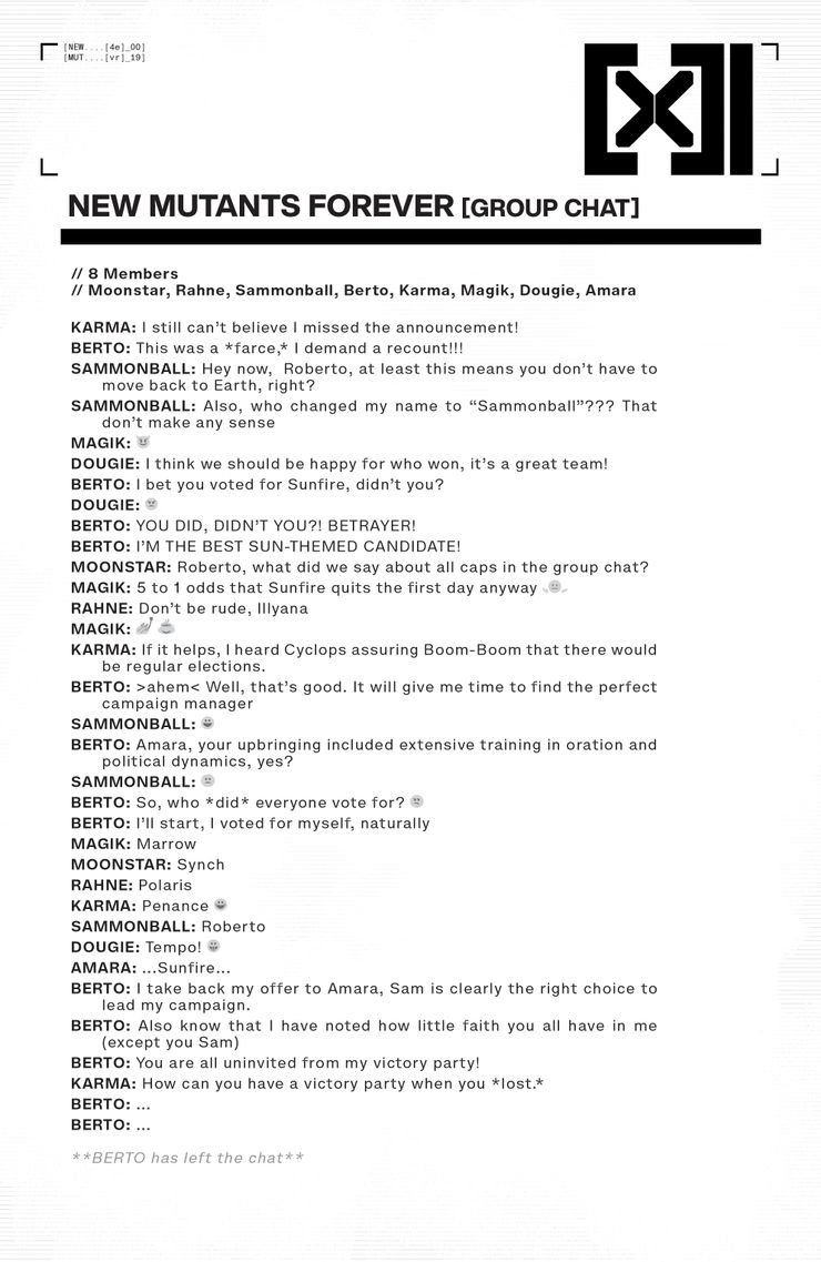 Naturalmente, esto ha planteado preguntas sobre cómo se elegirán los futuros miembros, y un extracto de un chat grupal de New Mutants que se muestra en este número revela, a través de conversaciones entre Sunspot, Magik, Cypher y otros que, según Cyclops, los futuros miembros serán elegido mediante elecciones.