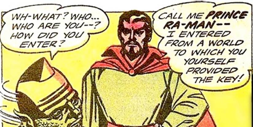 Finalmente, eso lleva al Príncipe Ra-Man al primer plano. Algunos lectores pueden estar confundidos sobre dónde están sus lealtades, ya que lucha contra el Doctor Oculto en su primera aparición. Dejando de lado su alboroto, el Príncipe Ra-Man es un héroe, y sus orígenes siempre lo han enraizado en el lado de los héroes. Su primera aparición se produce en 1965. Casa de los secretos #73 de la historia “La muerte de Mark Merlin” de Bob Haney y Bernard Baily. Antes de ser el Príncipe Ra-Man, fue Mark Merlinque debutó por separado en 1959 Casa de los secretos #23.