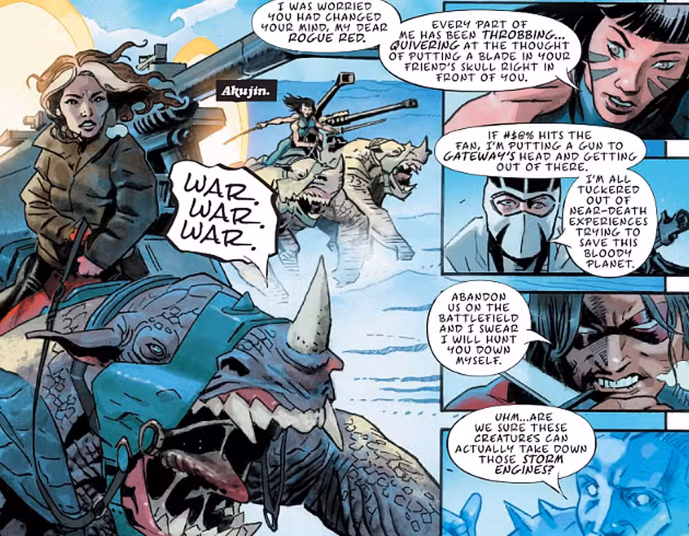 En un toque extraño, el X-Force de Red Rogue llega a la batalla montado en criaturas de dinosaurios mutadas que cantan “GUERRA” a medida que avanzan. Es un elemento de construcción de mundos extraño pero efectivo, que resalta cuán duro es en realidad el equipo, mientras corren hacia una confrontación con los secuaces de Storm, abriéndose camino hacia su antiguo aliado en una misión mortal.