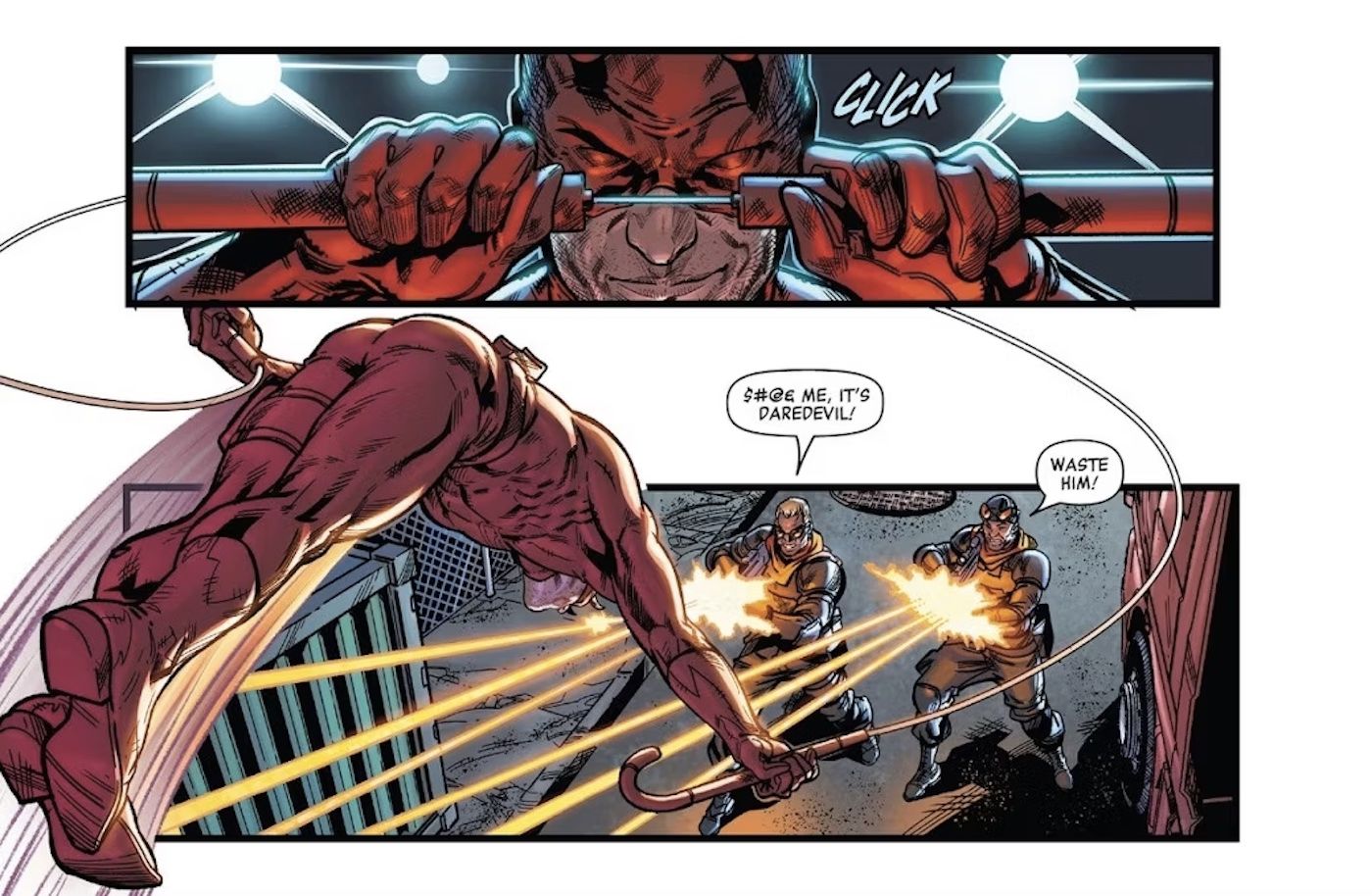 Cuando Daredevil lucha por entender por qué Ben Urich se ha vuelto contra él en Saladin Ahmed, Aaron Kuder, Farid Karami y Jesus Aburtov. Temerario (2023) #3, decide intentar aclarar su mente eliminando a “The Heat”, la pandilla más nueva de Hell’s Kitchen. Para gran diversión de Murdock, cada vez que ataca a un grupo de pandilleros, uno de ellos grita: “$#@& yo, ¡es Daredevil!“