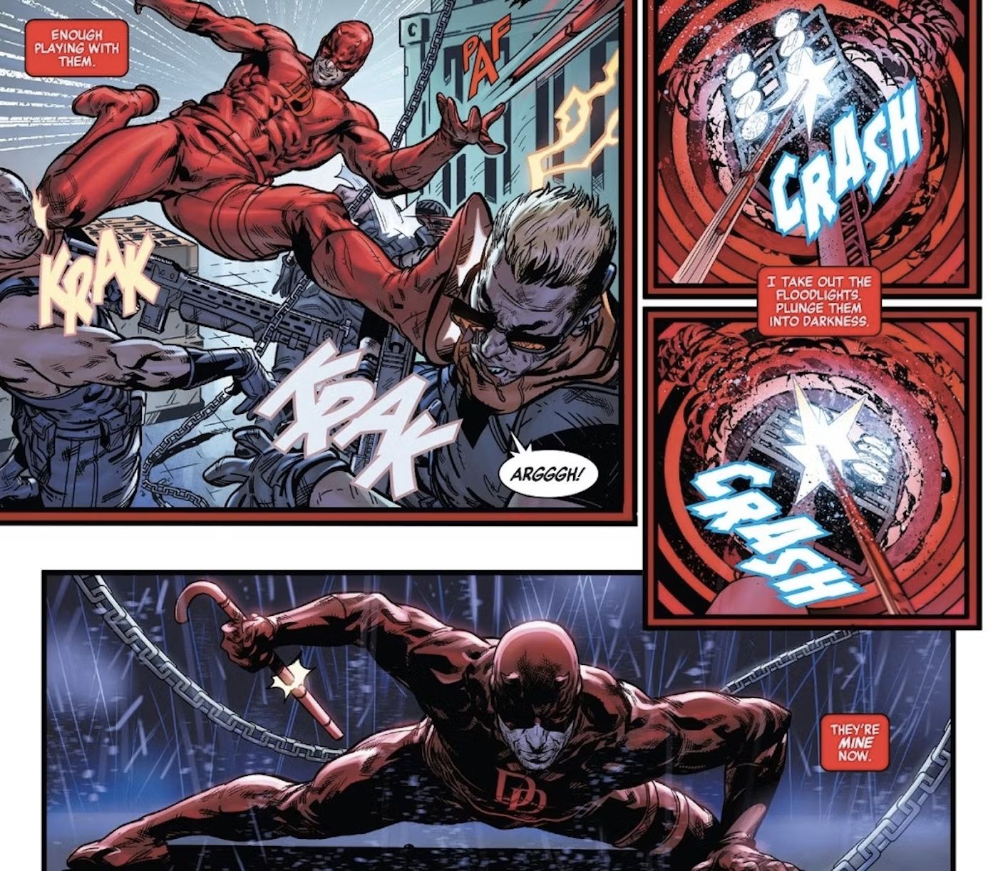 “/> Disfrutando del terror de su enemigo, Murdock se apresura a bromear diciendo que el insulto debería convertirse en su nuevo eslogan cuando se lanza a la batalla, administrando una brutal paliza a los desafortunados miembros de la pandilla.