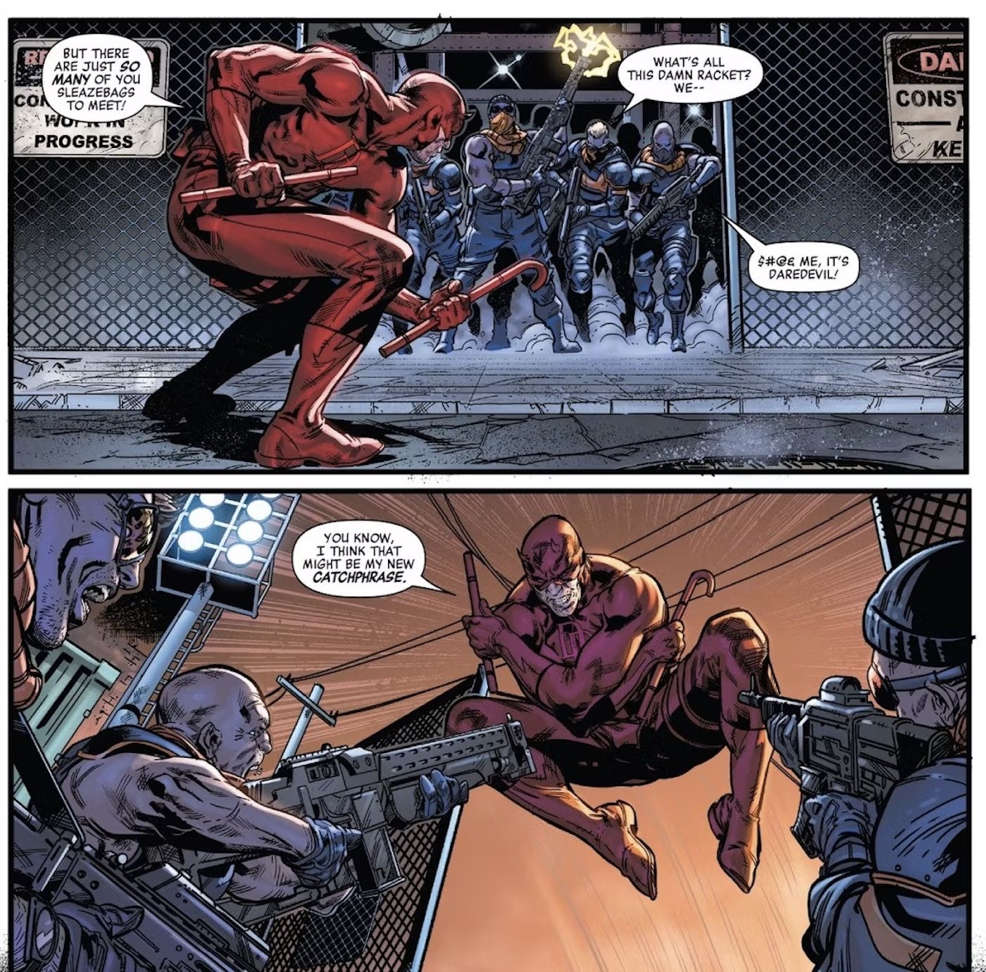 - El nuevo eslogan de Daredevil “$#@& yo, ¡soy Daredevil!” destaca el terror que esparce por Hell’s Kitchen, en contraste con la personalidad de “vecindario amigable” de Spider-Man.