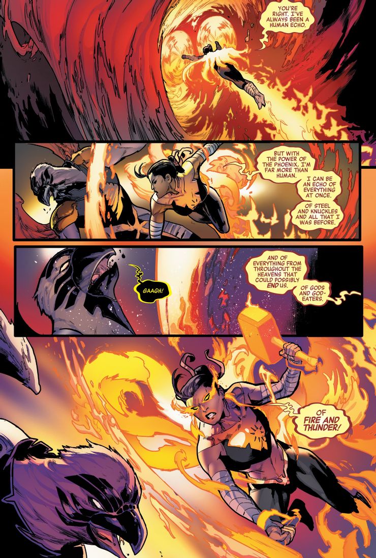 Echo de Maya Lopez fue elegido para convertirse en el próximo Fénix después de ser asesinado por Namor durante los Vengadores. Torneo Phoenix historia. Resurgiendo de las cenizas de esa derrota, Maya ahora se ha convertido en uno de los héroes más poderosos de los Vengadores (al mismo tiempo que es el más volátil). El poder del Fénix es increíblemente peligroso y, a menudo, corruptor, manipula a sus anfitriones hacia la destrucción por encima de su capacidad de crear. Habiendo dicho eso, Vengadores # 51 del escritor Jason Aaron y el artista Juan Frigeri presenta a Maya usando sus habilidades originales junto con las nuevas, luchando contra un trío de villanos de realidad alternativa en Asgard junto a Thor y Iron Man.