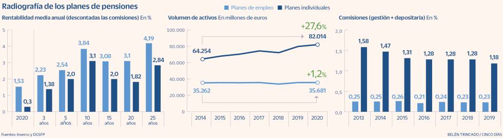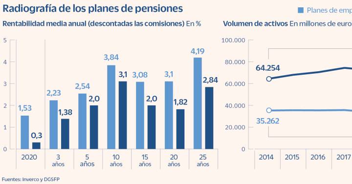 En los últimos 20 años, la rentabilidad media de los planes de empleo ha sido del 3,1%, mientras que en los individuales ha sido del 1,8%, según datos de Inverco. Tal vez la diferencia no parezca enorme pero, si alguien invirtió en un plan individual 10.000 euros el primer año y luego 2.400 euros cada año, habría acumulado 72.500 euros en un plan individual y 13.000 más en uno de empleo. La diferencia de rentabilidades tiene varias explicaciones (el volumen de los planes, la política de inversiones…) pero hay una evidente: las comisiones. De acuerdo con datos de la Dirección de Seguros y Fondos de Pensiones, los planes individuales aplican de media una comisión anual del 1,18%, mientras que los de empleo cobran un 0,23%.