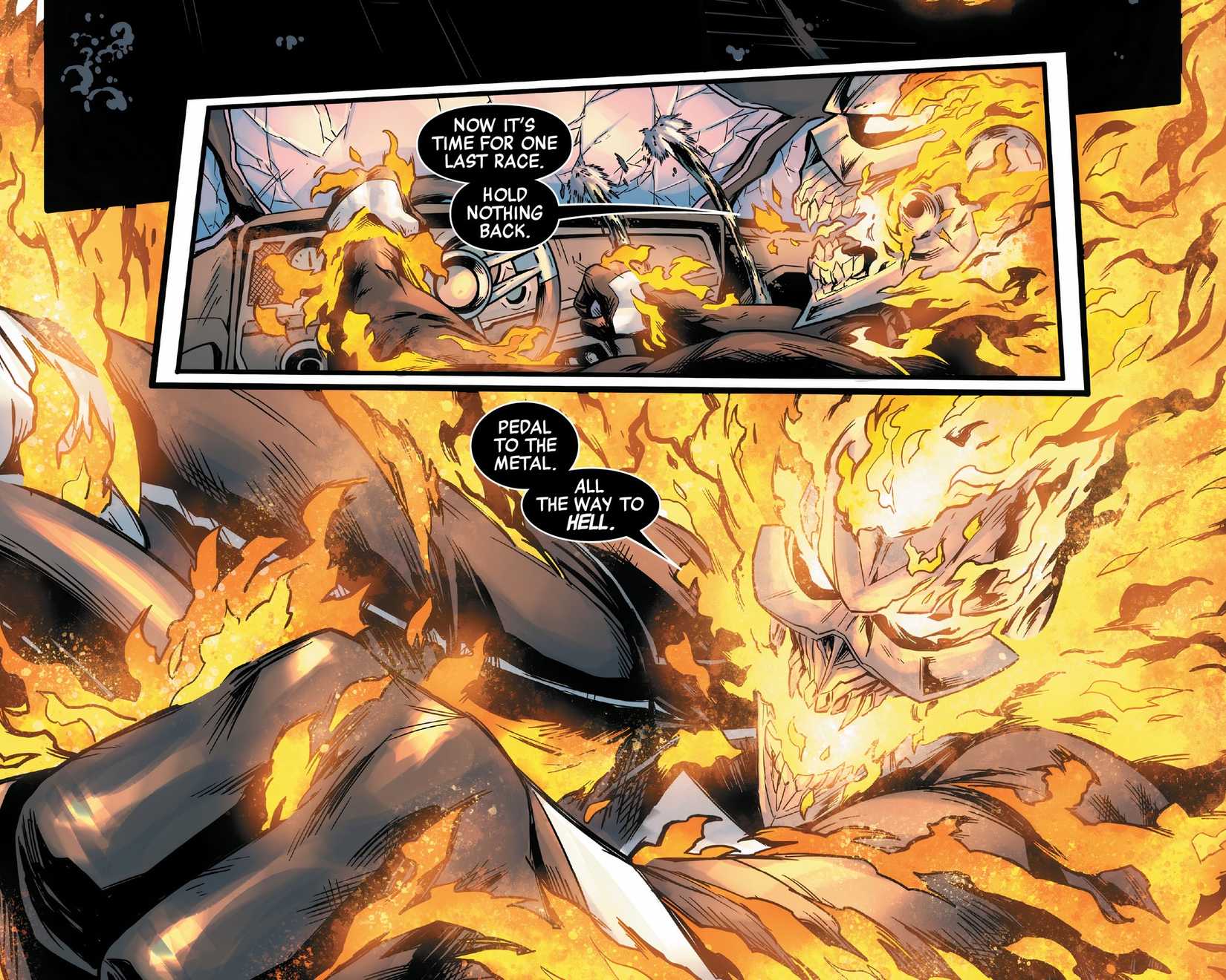 El nuevo Ghost Rider vestido de cuero, armado con tentáculos espectrales y patines imbuidos de fuego del infierno, parece haber encontrado una manera de salir del Primer Cosmos y tiene como objetivo al hermano menor de Robbie, Gabe. Patinando a través de un portal, este Espíritu de la Venganza desconocido aparece en una pista de patinaje donde Gabe y su amigo están disfrutando el día. Sin embargo, Robbie, el hermano ferozmente amoroso que es, sigue al enemigo en llamas de regreso a la Tierra-616. con una jauría de perros del infierno a cuestas.