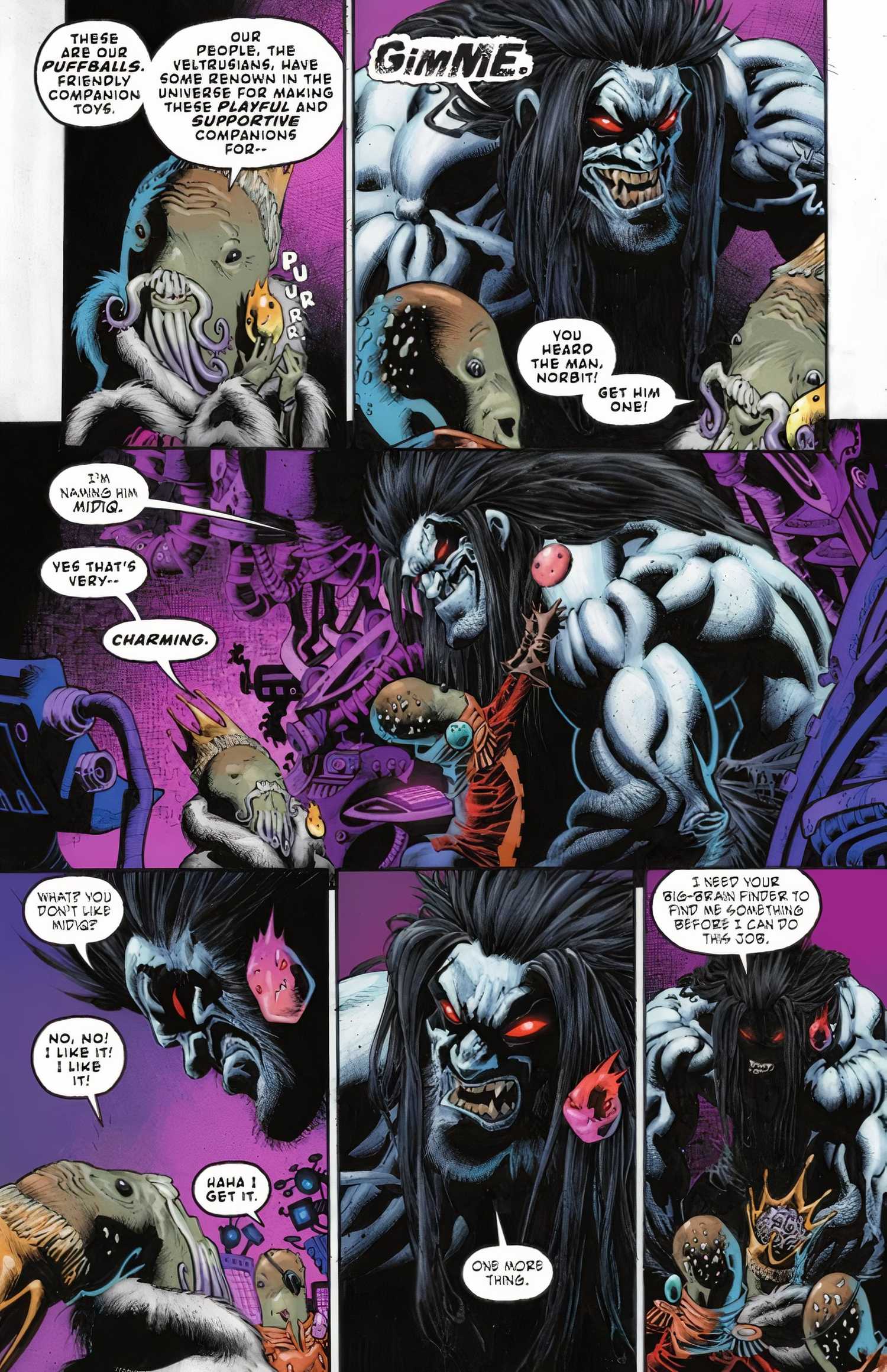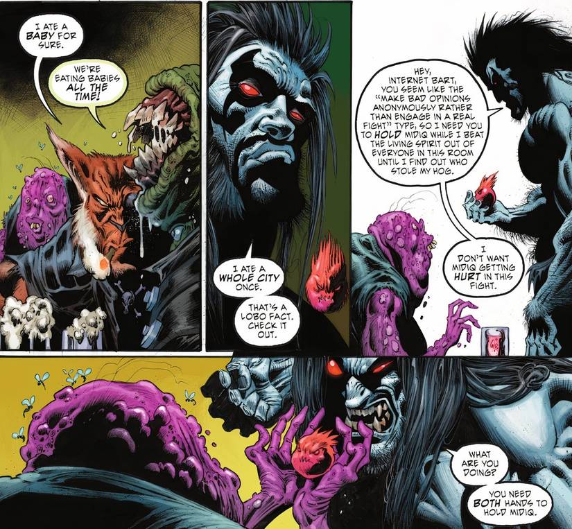 Otro momento memorable ocurre cuando Lobo está a punto de pelear en un bar e instruye a un transeúnte alienígena a “mantén presionado Midiq” explicando, “No quiero que Midiq salga lastimado en esta pelea”. Cuando el alienígena toma el Puffball con una mano, Lobo responde: “¿Qué estás haciendo? Necesitas ambas manos para sostener a Midiq”. Otros momentos destacados incluyen un extraterrestre que se refiere a Midiq como “pequeño,” provocando la respuesta amenazadora de Lobo, “¿Acabas de llamar pequeño a Midiq?” y al final del número, cuando Midiq explota tristemente durante la batalla con Murdercrotch Slaughterface, Lobo gruñe: “Hiciste explotar a Midiq”. Claramente, no faltan chistes entretenidos en este viaje salvaje.