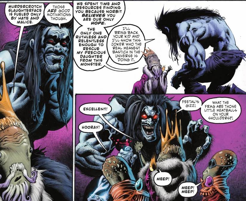 Kyle Starks no pierde ni un segundo de página antes de sumergirse directamente en los chistes de Midiq. El primer chiste sigue al bautizo de Puffball, cuando el Rey de los Veltrusianos responde a la elección del nombre de Lobo con un vacilante: “Sí, eso es muy… encantador”. En respuesta, Lobo responde: “¿Qué? ¿No te gusta Midiq? Sintiendo la amenaza en la pregunta de Lobo, el Rey comienza a humillarse, declarando profusamente cuánto lo ama. Esto prepara el escenario para una escena hilarante, que marca solo el comienzo de los chistes Midiq cada vez más escandalosos que Starks teje a lo largo del cómic.