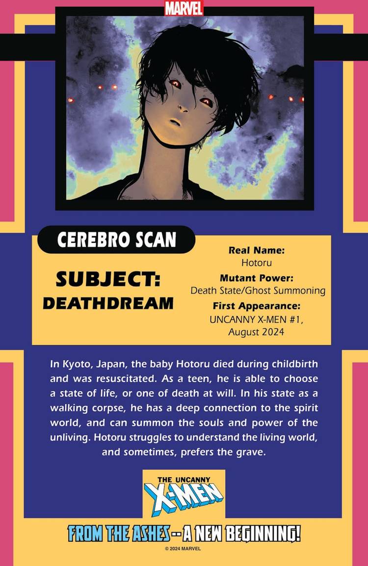 Desde el breve vistazo al perfil de Deathdream, revelado en el avance de Los X-Men más misteriosos #2, Es difícil decir cuán extensos son sus poderes nigrománticos, cuán poderosas son sus evocaciones, si puede viajar a los muchos reinos del más allá de Marvel o si se lo considera inmortal o no, aún son misterios. Lo que es seguro es que Hotoru se ha convertido rápidamente en uno de los mutantes jóvenes más prometedores e interesantes de los X-Men. El poder sobre la muerte, algo que personajes como Thanos han pasado vidas intentando conseguir, es tan extraordinariamente poderoso que el adolescente debe llegar a dominar.