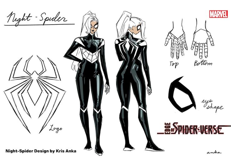 Night-Spider combina Black Cat de Felicia Hardy con Spider-Man, ya que el héroe mantiene su esquema de color habitual en blanco y negro, pero obtiene un disfraz más con un tema de araña. Night-Spider tiene un logotipo de araña blanca gigante en la espalda, una cinta blanca en el centro del pecho y una máscara para los ojos que combina a la perfección las máscaras más icónicas de Black Cat y Spider-Man.