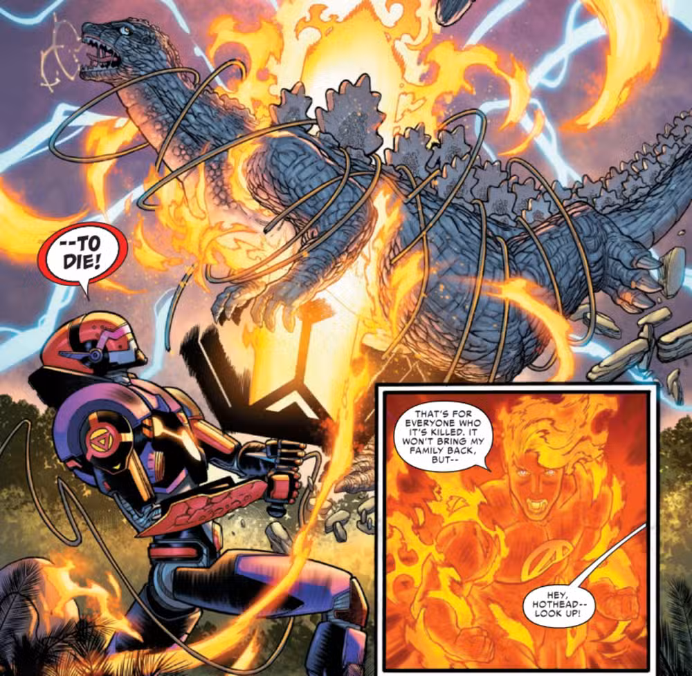 Es la combinación definitiva de superpoderes de Marvel, canalizados en un solo cuerpo por el genio de Black Panther. En su movimiento final, el traje se convierte en restricciones gigantes, lo que permite a los héroes lanzar a Godzilla al espacio… justo cuando Reed Richards decodifica un mensaje del futuro advirtiéndoles. nunca para permitir que Godzilla salga del mundo.