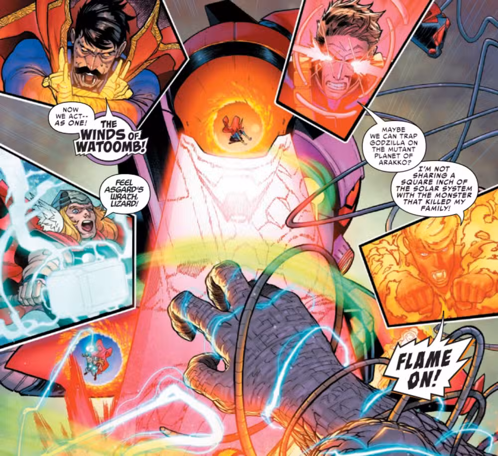 En el transcurso de esta serie, todos, desde los X-Men y los Cuatro Fantásticos hasta los villanos unidos de Marvel, se han enfrentado a Godzilla, aparentemente sin éxito. Doctor Strange desterró al Titán fuera de la realidad, solo para que pudiera regresar, mientras que Hulk creció hasta alcanzar un tamaño gigante y fue atacado con martillos forjados con vibranio irrompible. Nada de eso fue suficiente para detener el alboroto de Godzilla, y muchos héroes aparentemente perecieron en el intento.
