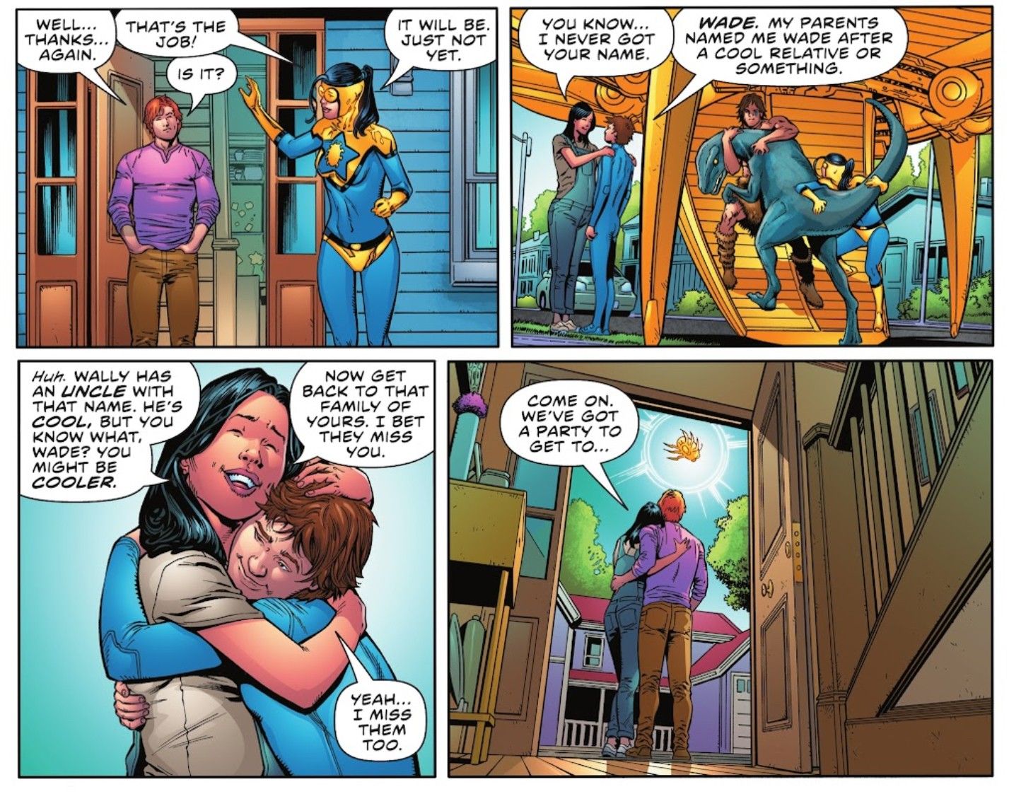 El hijo de Flash confirma que su nombre es Wade en El relámpago #796 por Jeremy Adams, Fernando Pasarin, Roger Cruz, George Kambadais, Oclair Albert, Wellington Dias, Pete Pantazis, Matt Herms, Luis Guerrero y Rob Leigh. Cuando la esposa de Wally West, Linda, le pregunta al joven con el que han estado trabajando cuál es su nombre, él responde: “Vadear. Mis padres me llamaron Wade por un pariente genial o algo así.Linda sonríe y revela que Wally tiene un tío con el mismo nombre. Mientras tanto, en Twitter, Destello escritor jeremy adams reveló los verdaderos orígenes del nombre Wade.