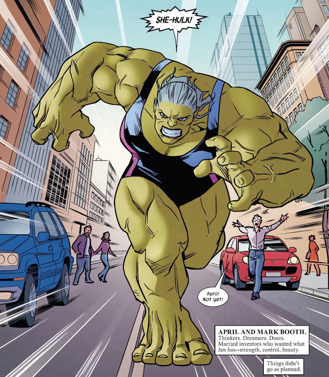 Avancemos hasta ahora, donde April ha estado acechando a Hulk, quien lleva a April al distrito de She-Hulk en Nueva York. El estado mental de April se ha deteriorado durante mucho tiempo hasta el punto de que su único interés ahora es demostrar que es la mejor Hulk. No la mejor She-Hulk, sino el mejor Hulk. Es por eso que ha estado persiguiendo al Hulk original, la fuente original de Gamma en las muestras de sangre de Jen que ella y su esposo robaron antes, para matarlo y tomar su lugar como el mejor Hulk. Ciertamente presenta un argumento convincente al final de la historia, donde evade una carga de Hulk, obligándolo a estrellarse contra un edificio que cae encima de él para poner fin al problema.