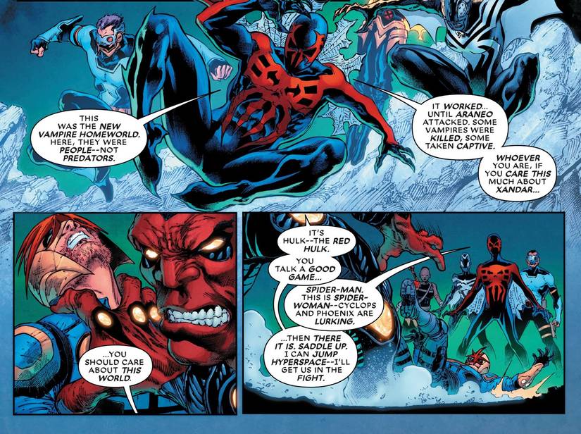 Conquista 2099 El número 3 de Steve Orlando, Ibraim Roberson, José Luis, Oren Junior, Andrew Dalhouse y Cory Petit comienza con Wolverine (que aquí es la Última Nova) y su equipo intentando seguir el rastro de Drácula hasta los Araneons. Pide un favor que se le debe, lo que convoca a Red Hulk como un cohete carmesí que sale de las estrellas. Después de expresar sus quejas contra Nova, Hulk acepta llevar al grupo al campo de batalla.