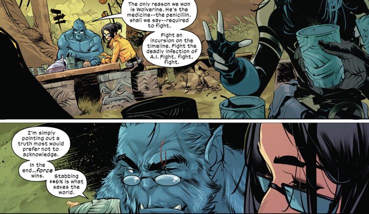 Si bien Beast se ha vuelto súper oscuro y cínico en los últimos años, no está equivocado con este nuevo eslogan que Logan podría adoptar fácilmente. Aunque la acción, la violencia y el conflicto son inherentes a los cómics de superhéroes, Krakoa siempre será vista como una amenaza y siempre estará en peligro. Es una nación completamente independiente de mutantes potenciados que surgieron en el mundo tan rápido como esos mismos mutantes terraformaron más tarde a Marte (renombrándolo Arakko). El conflicto y las amenazas a su seguridad vienen con el territorio cuando se realizan movimientos tan grandes. Como tal, el papel de Wolverine es muy crucial y Beast lo sabe: “Apuñalar $#&% es lo que salva al mundo.