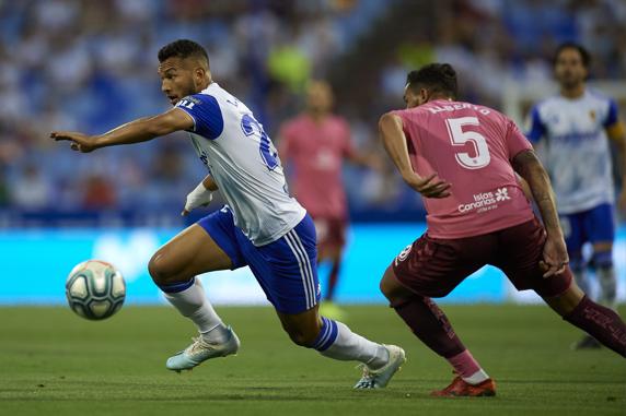Luis Suárez se va del jugador del Tenerife Alberto, en una acción del partido disputado el 17 de agosto de 2019 en La Romareda.