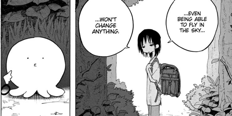 La única forma en que los lectores pueden pasar por el primer capítulo de esta serie deprimente sin caer en un pozo profundo de desesperación es debido a las travesuras de Happien y la sobreabundancia de ternura. La criatura no parece poseer ninguna habilidad analítica o simplemente es incapaz de detectar o comprender nada negativo. Como tal, todas las cosas terriblemente deprimentes que Shizuka murmura simplemente no cuadran con Happien, quien responde de una manera que demuestra una ingenuidad extrema o un optimismo inquebrantable. Cuando Shizuka rechaza una sugerencia que la hará feliz, Happien se recupera con otra alternativa.