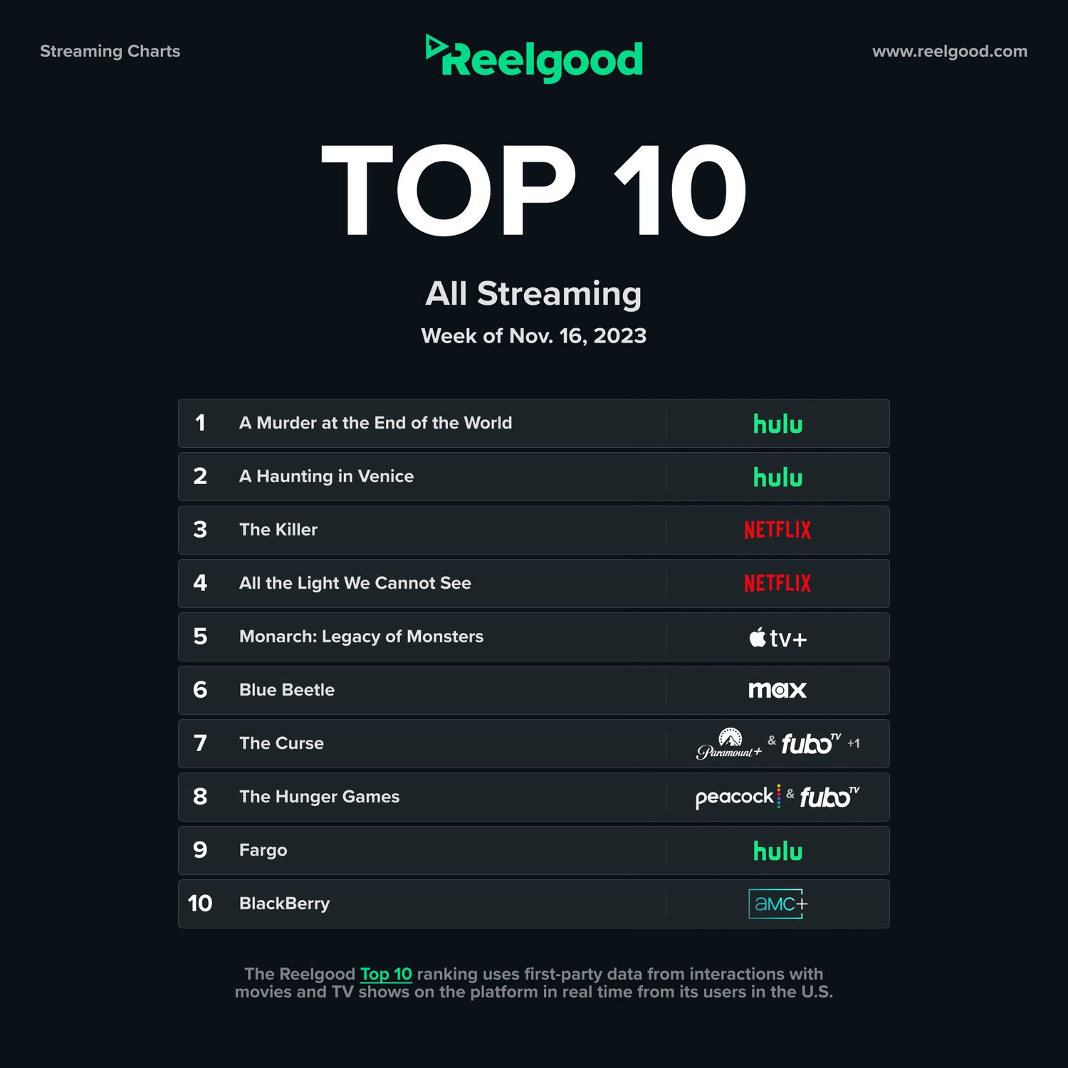 Ahora, según datos compartidos por carretebueno, Un asesinato en el fin del mundo La temporada 1 está demostrando ser un éxito para Hulu. Durante la semana del 16 al 22 de noviembre, la serie se ubica como el programa o película más popular en streaming. La serie supera a la de Hulu Una inquietante Venecia en el puesto número dos, Netflix El asesino en el número tres, Netflix Toda la luz que no podemos ver en el puesto número cuatro, y Apple TV Plus’ Monarca: Legado de monstruos en el número cinco. Consulte el cuadro completo de los 10 mejores de Reelgood a continuación: