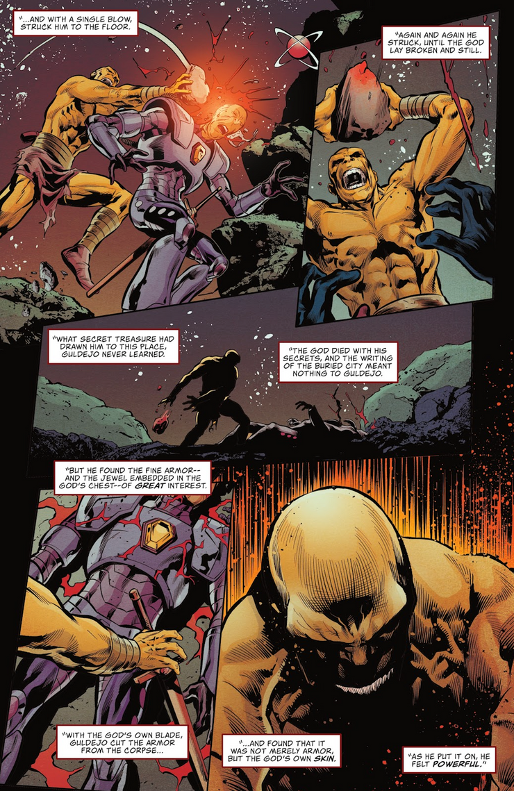 Guldejo robó la extraña armadura de la criatura, que le dio un tremendo poder. Rápidamente se hizo cargo de los demás de su Warzoon, y nadie se atrevió a desafiarlo, excepto su propio hijo, quien tomó el título de Mongul (que significa “el más fuerte” en el idioma nativo) para sí mismo. Cada Mongul posterior toma la armadura y se vuelve más fuerte que su predecesor. Si bien Darkseid nació con poder (y nació como hijo del rey Yuga Khan), el primer mongul no tenía nada y, en cierto modo, comenzó su vida incluso más débil que Clark Kent.