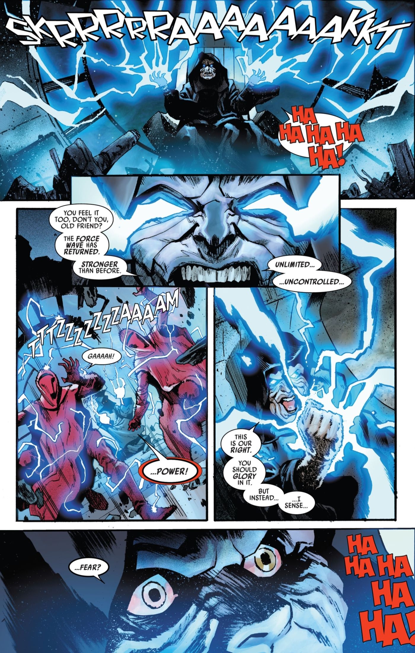 En Guerra de las Galaxias: Darth Vader # 33 de Greg Pak y Adam Gorham, el emperador Palpatine y Darth Vader todavía sienten las fluctuaciones en la Fuerza que se introdujo algunos números antes. Esencialmente, la corriente cósmica de la Fuerza está fluyendo y refluyendo por todo el cosmos. Esto significa que cualquiera que sea sensible a la Fuerza pasa por períodos en los que no puede sentir una conexión con la Fuerza en absoluto, y luego, de repente, siente una oleada de poder como nunca antes había sentido. Incluso Darth Vader no puede controlar su poder cuando es golpeado con todo el poder de la Fuerza que fluye, lo que hace que accidentalmente destroce su nave y salga disparado al espacio. Mientras tanto, el Emperador sintió la misma oleada de poder, pero en lugar de temerlo como Vader, lo desató alegremente sobre sus propios guardias en forma de una tormenta de Force Lightning.