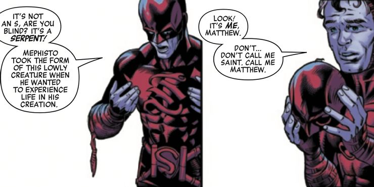 Ante esto, un nuevo cómic que forma parte de Marvel Héroes renacidos evento, Heroes Reborn: American Knights # 1, explora un mundo alternativo donde el justiciero de Matt Murdock ha sido apodado El Santo por la gente de Washington, DC (escrito por Paul Grist, tintas de Chris Allen con Marc Deering, colores de Guru-eFX, cartas de Cory Petit de VC). El Matt Murdock en Héroes renacidos es drásticamente diferente del que conocen los fanáticos: en lugar de ser un católico devoto, esta versión de Matt es un clérigo en la Iglesia de Mephisto (una figura similar a Satanás en el Universo Marvel). En cambio, el cristianismo en este universo se ve como un culto con una reputación similar a la de satanista, que cambia por completo el eje moral de su carácter. Además, este Matt Murdock mata voluntariamente a criminales y usa una serpiente estampada en la parte delantera de su traje, citando que mantiene el mundo más seguro con menos criminales en la calle.