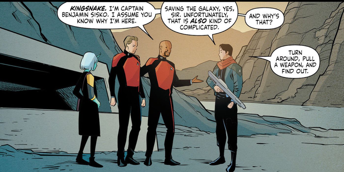 Star Trek El número 13 está escrito por Jackson Lanzing y Collin Kelly y dibujado por Marcus To. Los violentos y xenófobos Tzenkethi están consolidando su poder, lo que lleva a la Flota Estelar a enviar al Capitán Sisko y a la tripulación del Teseo investigar. A lo largo del número, se hacen varias referencias a un agente de la Flota Estelar que trabaja encubierto en el espacio Tzenkethi, llamado “Kingsnake”. Uno de los textos del número está elaborado para parecerse a un informe de Kingsnake a Starfleet Intelligence, que describe la amenaza. Posteriormente, la nave llega al espacio Tzenkethi. Tom Paris y un equipo visitante se dirigen al punto de contacto y se sorprenden al saber que “Kingsnake” es en realidad Harry Kim.