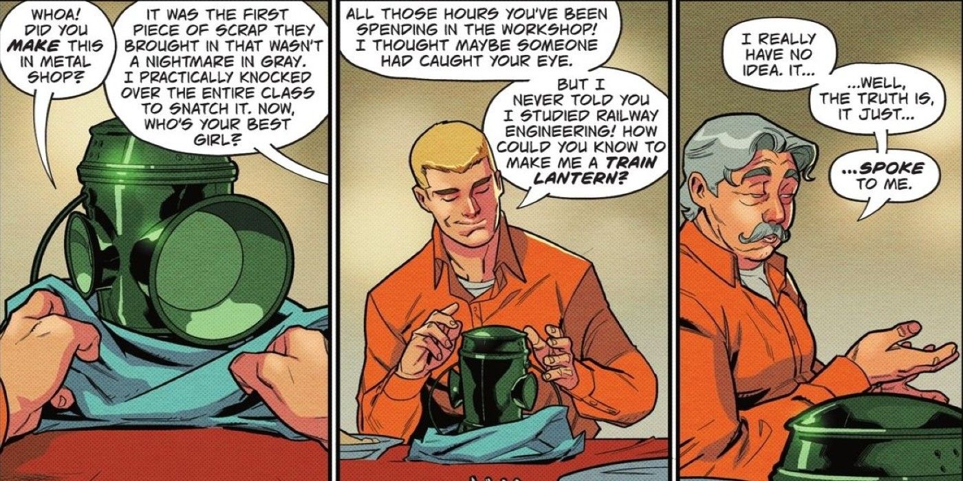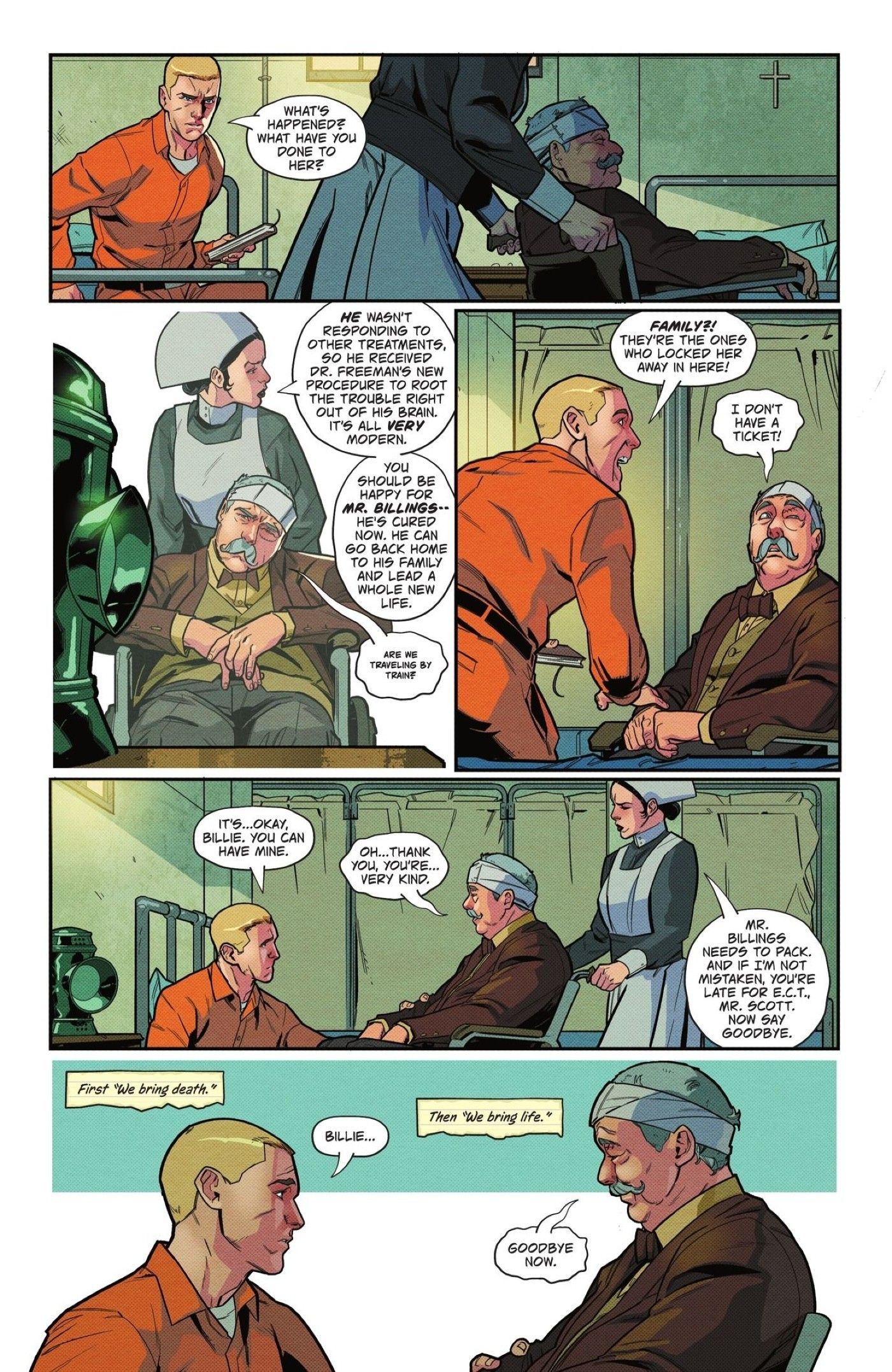 “/> Partes de Alan Scott: Linterna Verde La historia del número 2 ha sido adaptada de la primera aparición del personaje en la década de 1940. Cómics totalmente americanos #dieciséis. En esa historia, Billie (aquí llamada “Billings”) es una paciente en un hospital psiquiátrico. Nunca se revela por qué Billings está allí, pero trabajan en el taller del hospital. Un día, a Billings le traen un misterioso metal verde que luego transforman en lo que se convertirá en la linterna de Alan Scott. Mientras Billings trabaja en ello, se “curan mágicamente” y luego son dados de alta del hospital, libres para reanudar su vida. La historia reflejaba la comprensión de la comunidad médica de la época, pero seguía siendo problemática.
