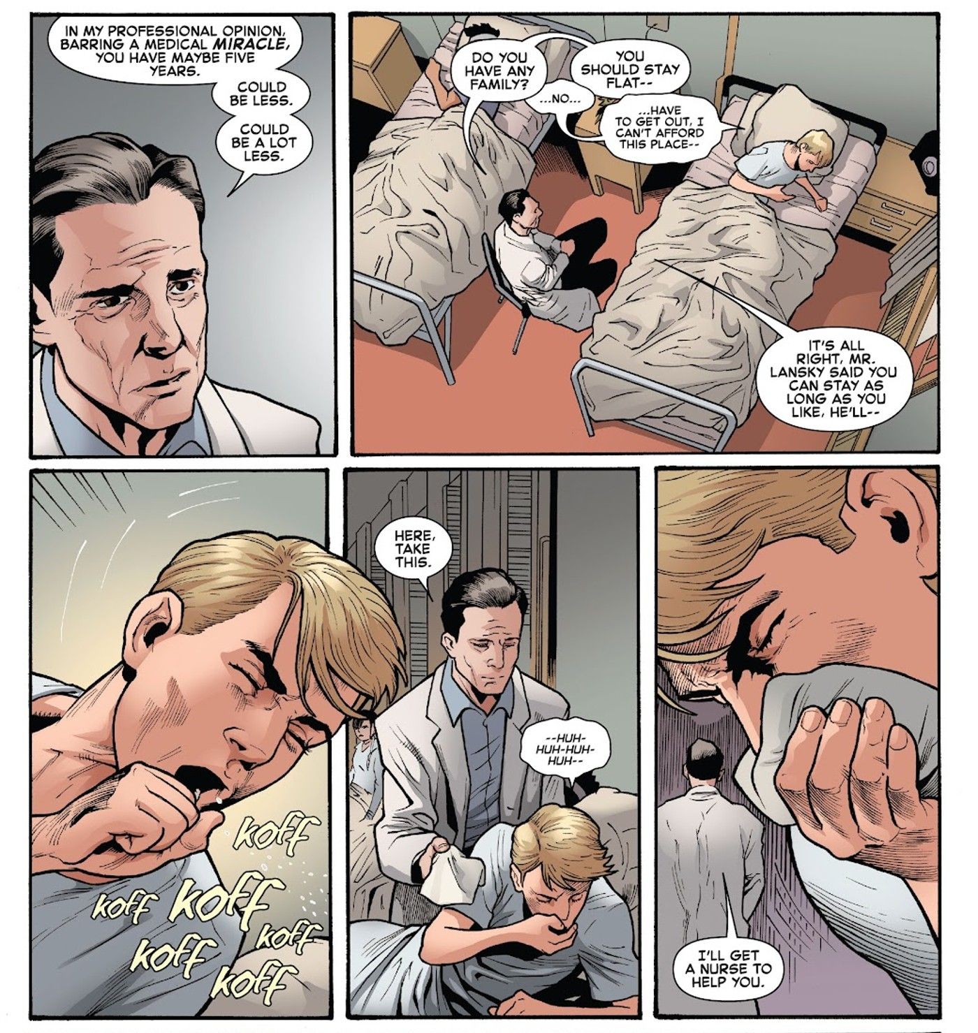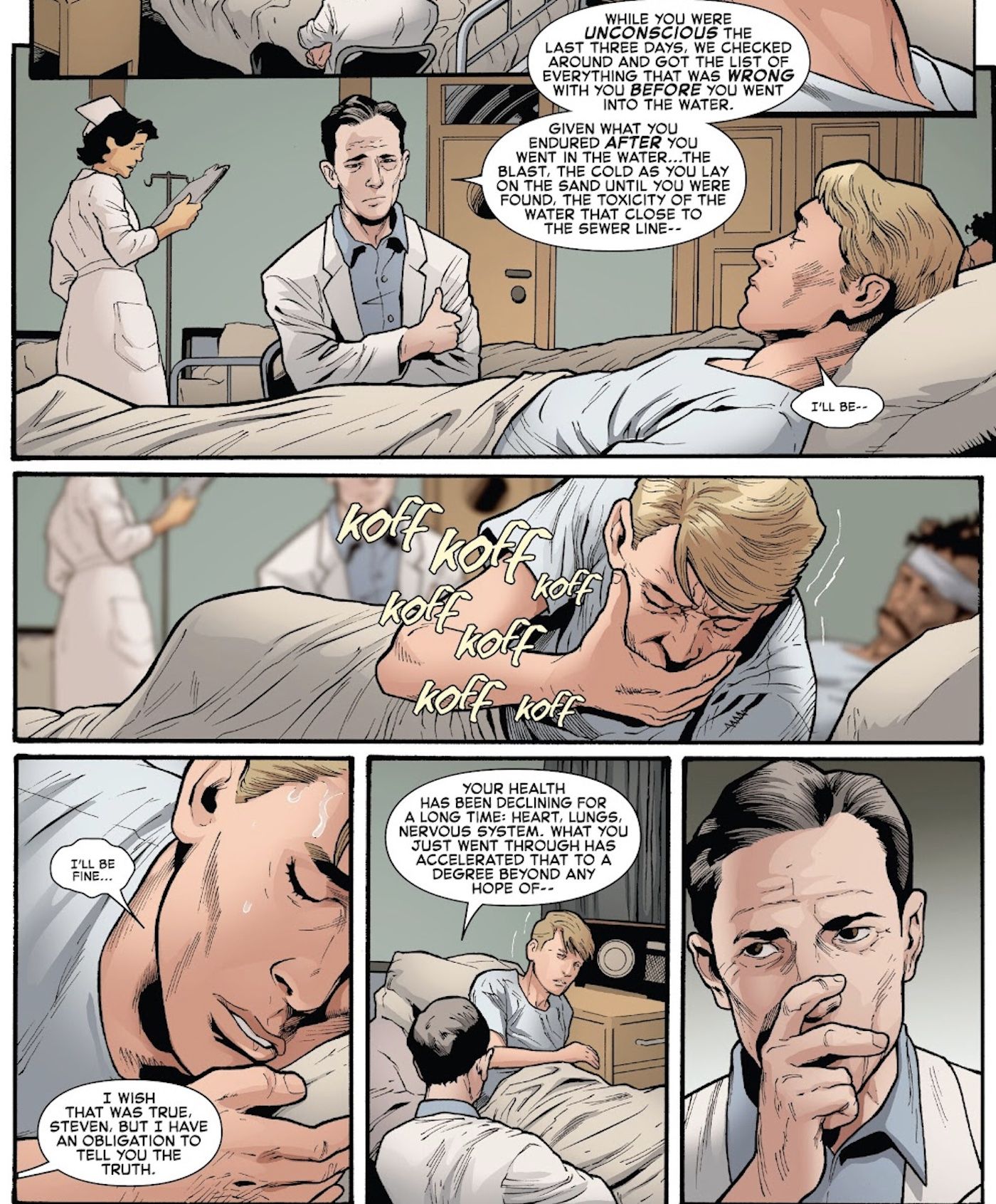 Al despertar en un hospital, el futuro Capitán América descubre que el trauma físico de su heroísmo combinado con sus dolencias preexistentes son una sentencia de muerte, lo que le da tal vez cinco años de vida. Y aunque convertirse en Capitán América claramente le salva la vida, esta revelación hace que la historia de Steve sea aún más trágica.