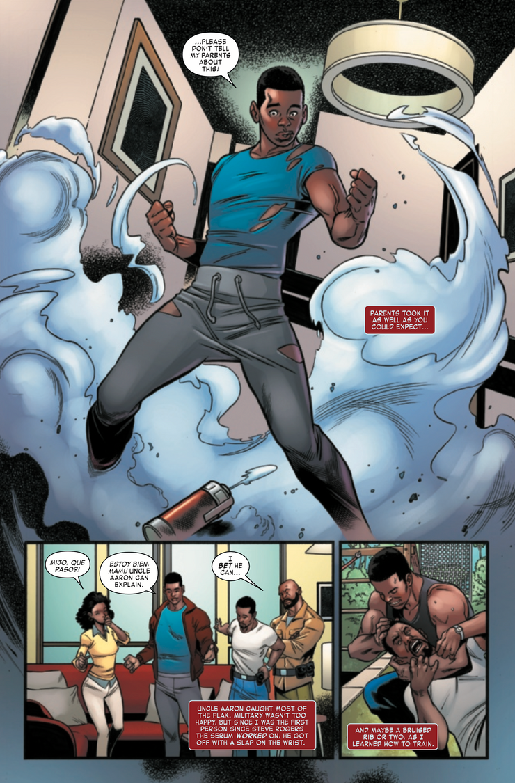 Steve Rogers quería alistarse en el ejército de los Estados Unidos a pesar de que claramente no cumplía con los requisitos físicos y casi seguro que moriría en Europa. Tomó la decisión de actuar y no hubo accidentes involucrados. Con respecto al origen de Ultimate Spider-Man, Miles se resistió a usar sus poderes para ayudar a otros hasta que fue testigo de la muerte de Peter Parker y se dio cuenta de que necesitaba usar sus dones para el mejoramiento de las personas que lo rodeaban. Una vez más, se hizo una elección, una que no está presente en esta historia en lo más mínimo. En un panel, él es Miles. En el siguiente, es el Capitán América.