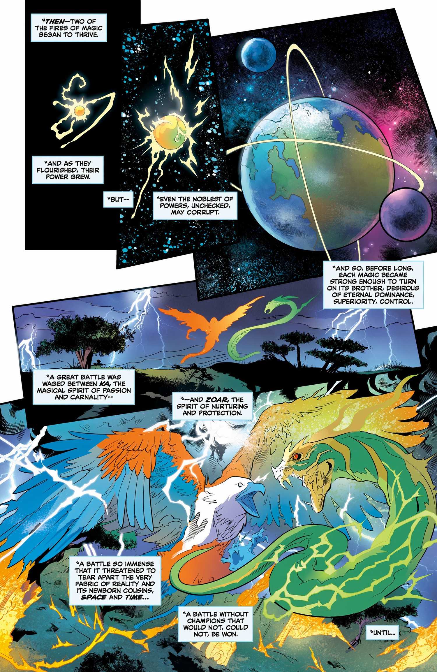 Maestros del Universo: Revolución El número 1 está escrito por Tim Sheridan, a partir de un guión de Sheridan, Rob Davis y Ted Biaselli, y está dibujado por Daniel HDR. Las primeras páginas del número describen el origen del universo. Dos fuerzas mágicas primordiales, encarnadas por un águila (Zoar) y una serpiente (Ka), luchan y amenazan con trastocar el universo naciente.