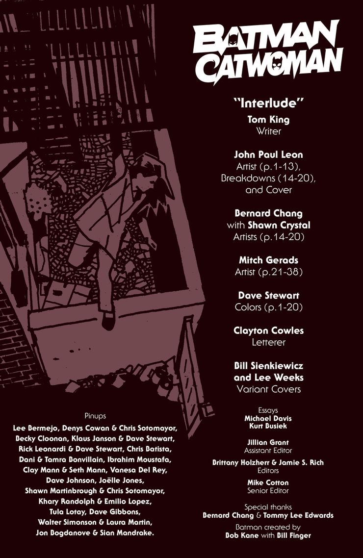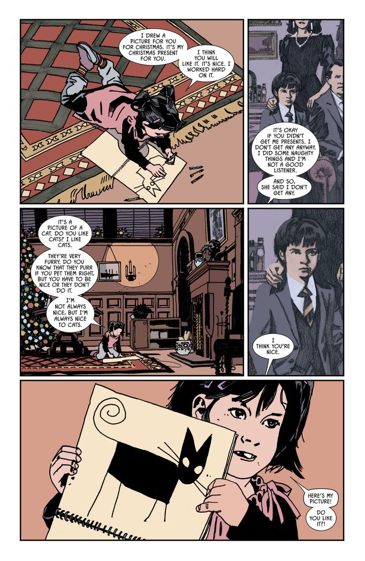 una vista previa para Especial Batman/Gatúbela #1 por Tom King, John Paul Leon, Bernard Chang, Mitch Gerards, Dave Stewart y Clayton Cowles muestra a una joven Selina Kyle creciendo en The Wayne Home For Orphaned Children. Ella muestra su independencia característica al deambular por la casa solo para tropezar con un retrato familiar de los benefactores del refugio. La solitaria Selina pasa las próximas Navidades con la imagen, después de haberle dado brillo a la imagen de Bruce, conversando y vinculándose con su amigo imaginario. Ella descubre la tragedia del tiroteo en Wayne y se aflige por Bruce, deseando poder estar allí para el chico que ha estado allí para ella.