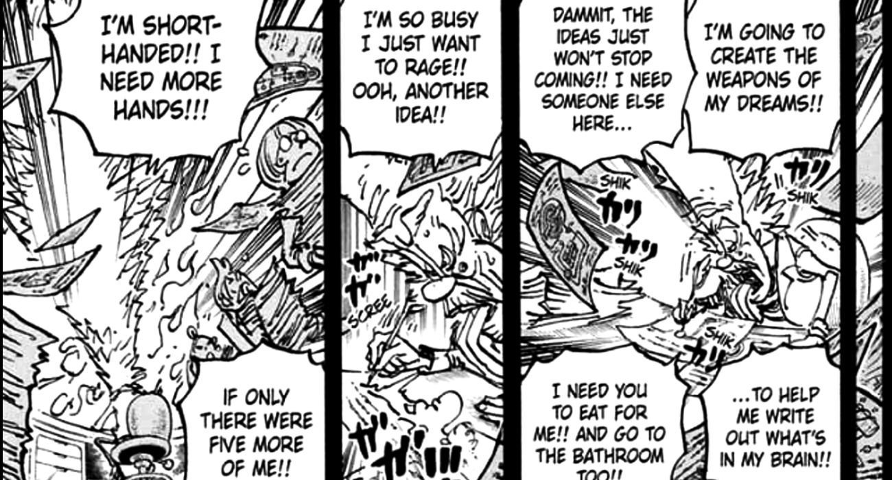 Capítulo #1100 de Una pieza fotos Vegapunk desearía que hubiera cinco más de él para comer y dormir por él y echarle una mano mientras su cerebro se desborda de ideas más rápido de lo que puede escribirlas. El capítulo revela que Vegapunk construyó sus satélites específicamente para que cada uno pudiera encargarse de una función específica. ya sea comiendo, durmiendo o haciendo una lluvia de ideas, lo que le permite a Vegapunk concentrarse más en su trabajo sin verse frenado por las necesidades del cuerpo humano.