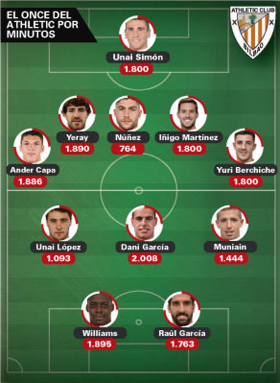 Del reparto de minutos en Liga en el Athletic se extraen varias conclusiones. La principal es que hay nueve piezas fijas para el míster de Derio: Unai Simón, Capa, Yeray, Iñigo Martínez, Yuri, Dani García, Muniain, Williams y Raúl García. Los dos puestos restantes, siempre que todos estén en condiciones, fluctúan dependiendo del rival de turno, del momento de forma de los futbolistas o del dibujo que estime oportuno Garitano.