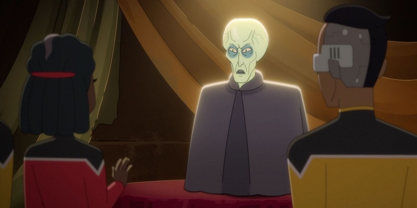 Cuando el Capitán Freeman y los miembros de la tripulación de Cerritos entran a la Taberna de Mudd y se acercan al Agente de Información, él habla de una manera muy entrecortada y tiene movimientos entrecortados. Freeman lo asume como un títere en una divertida devolución de llamada a Balok de Términos de servicio. Este alienígena, sin embargo, no es una marioneta, como confirma el teniente Sam Rutherford (Eugene Cordero) con su implante cibernético. Es posible que Balok conociera esta especie alienígena y basara el diseño de su títere en ella. También es posible que la aparición del Agente de Información sea simplemente una broma destinada a gritar TOS. De cualquier manera, es otra devolución de llamada divertida del equipo detrás. Star Trek: cubiertas inferiores.