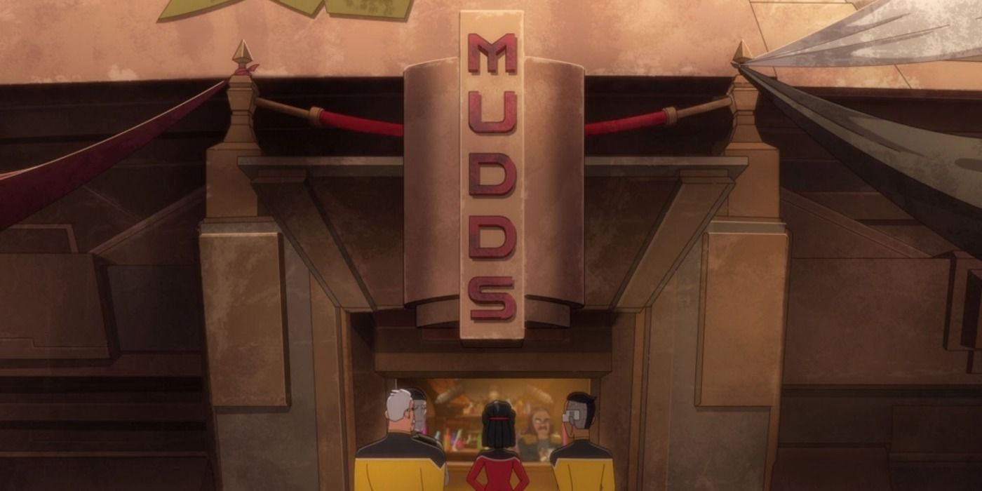 En su búsqueda de Locarno, la capitana Carol Freeman (Dawnn Lewis) y su tripulación viajan a un mercado negro en New Axton para encontrar información. Visitan una taberna para hablar con un agente de información que supuestamente conoce el paradero de Nick Locarno. En una divertida devolución de llamada a Star Trek: la serie original, la taberna que visitan se llama Mudds, una referencia a Harry Mudd (Roger C. Carmel), el estafador y contrabandista encontrado por el Capitán James T. Kirk (William Shatner) y el USS Enterprise. El propio intermediario de información actúa como otro Términos de servicio referencia, ya que se ve exactamente como el títere que se ve en el clásico Términos de servicio episodio “La maniobra de Corbomite”.